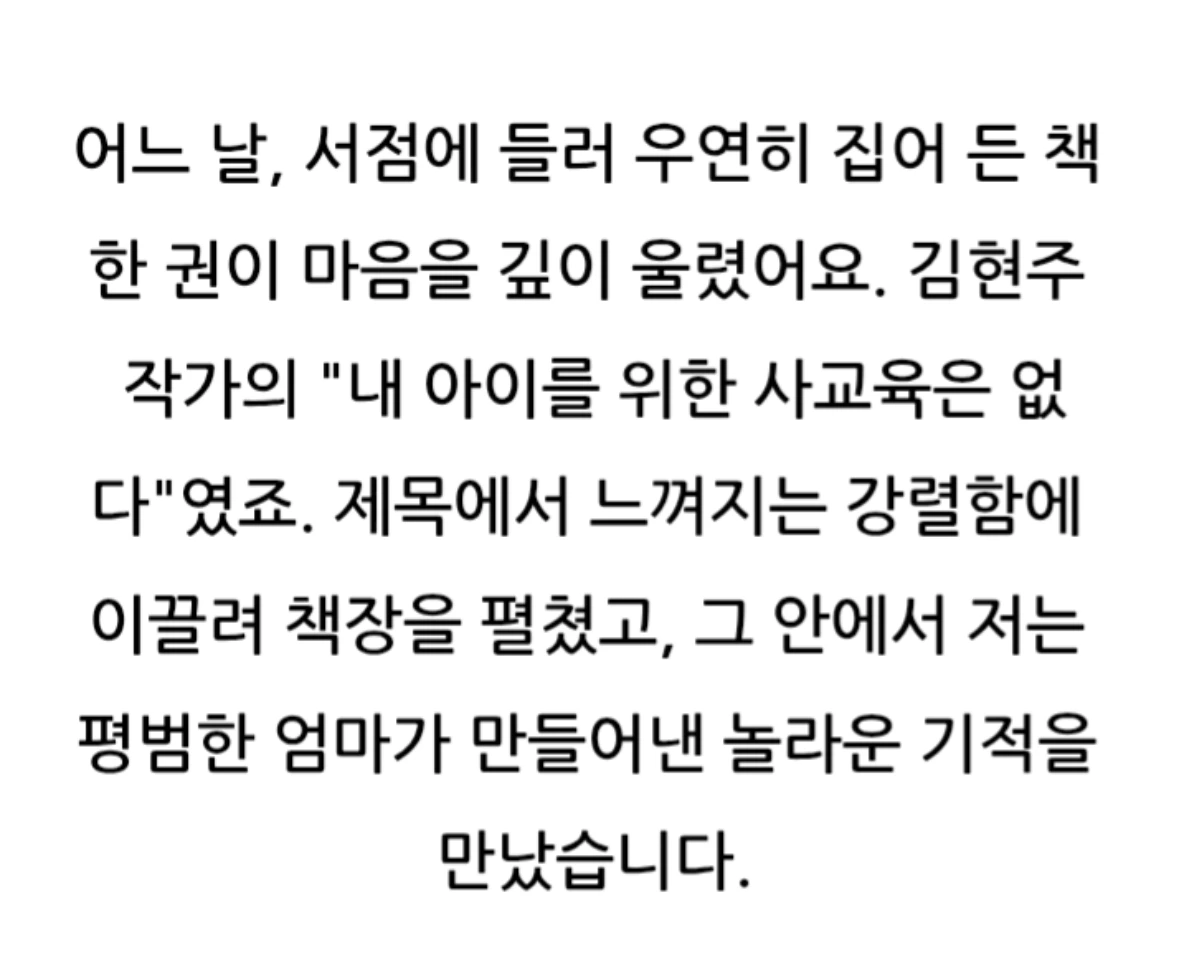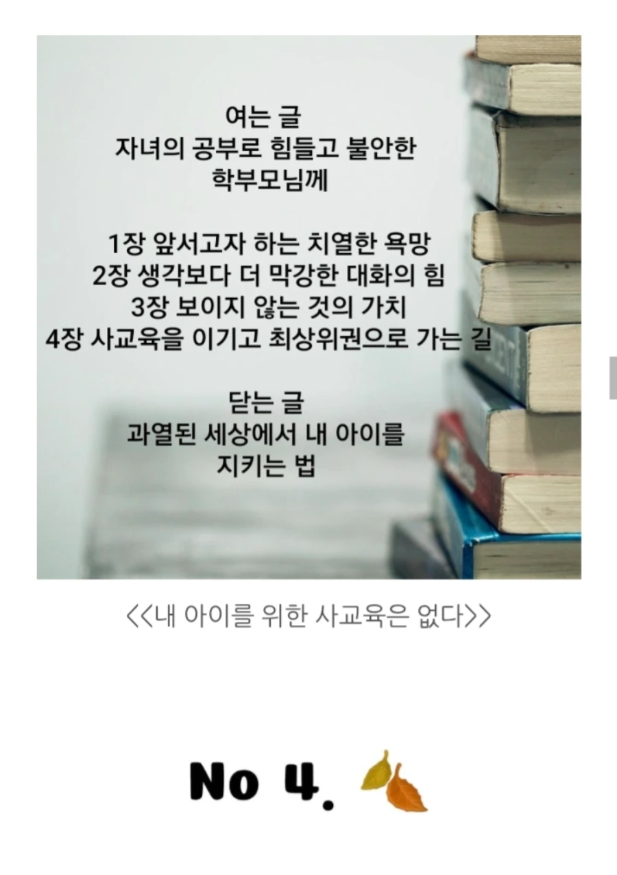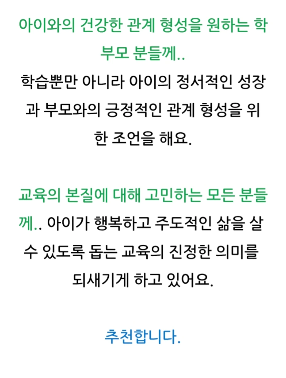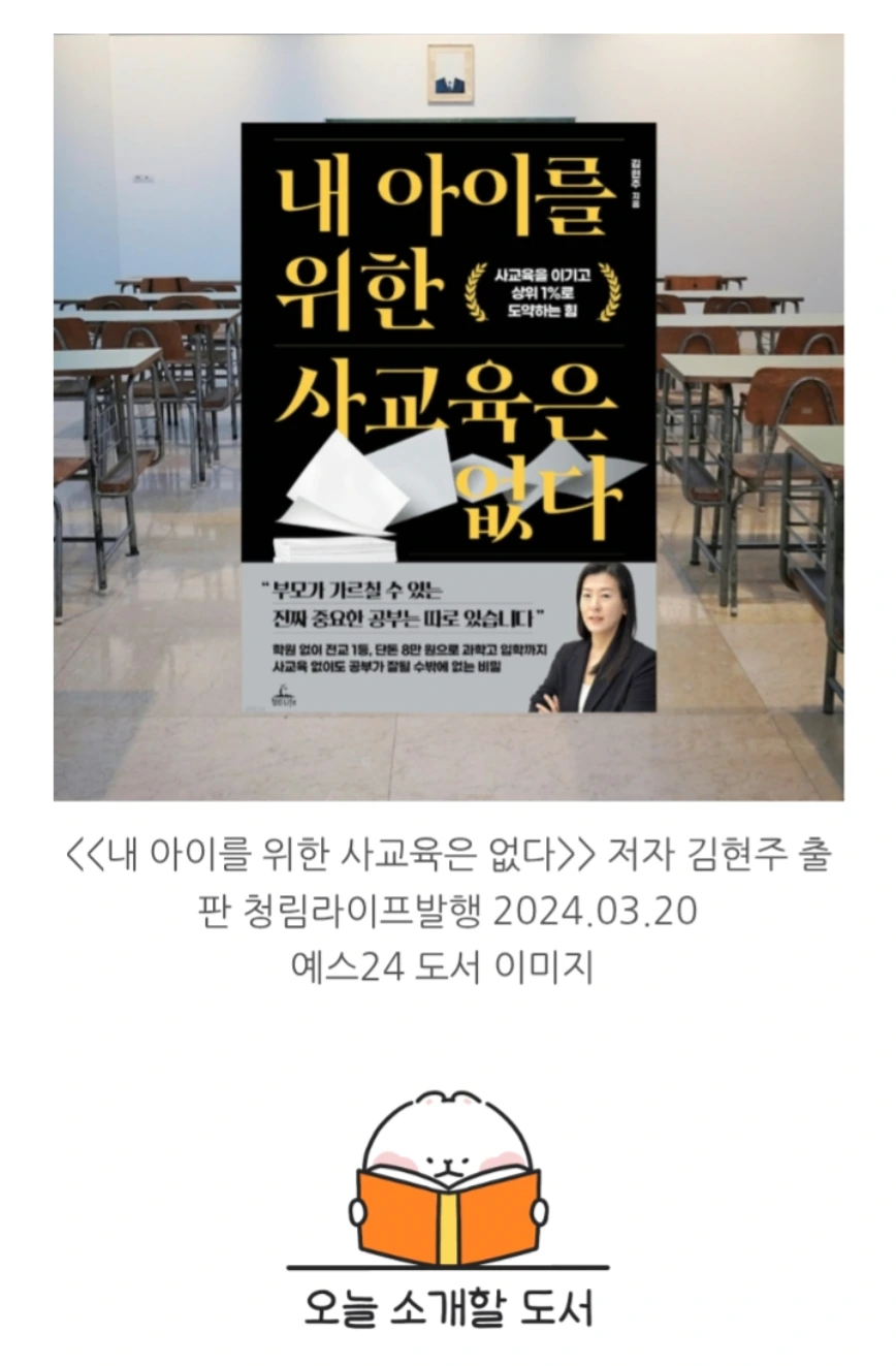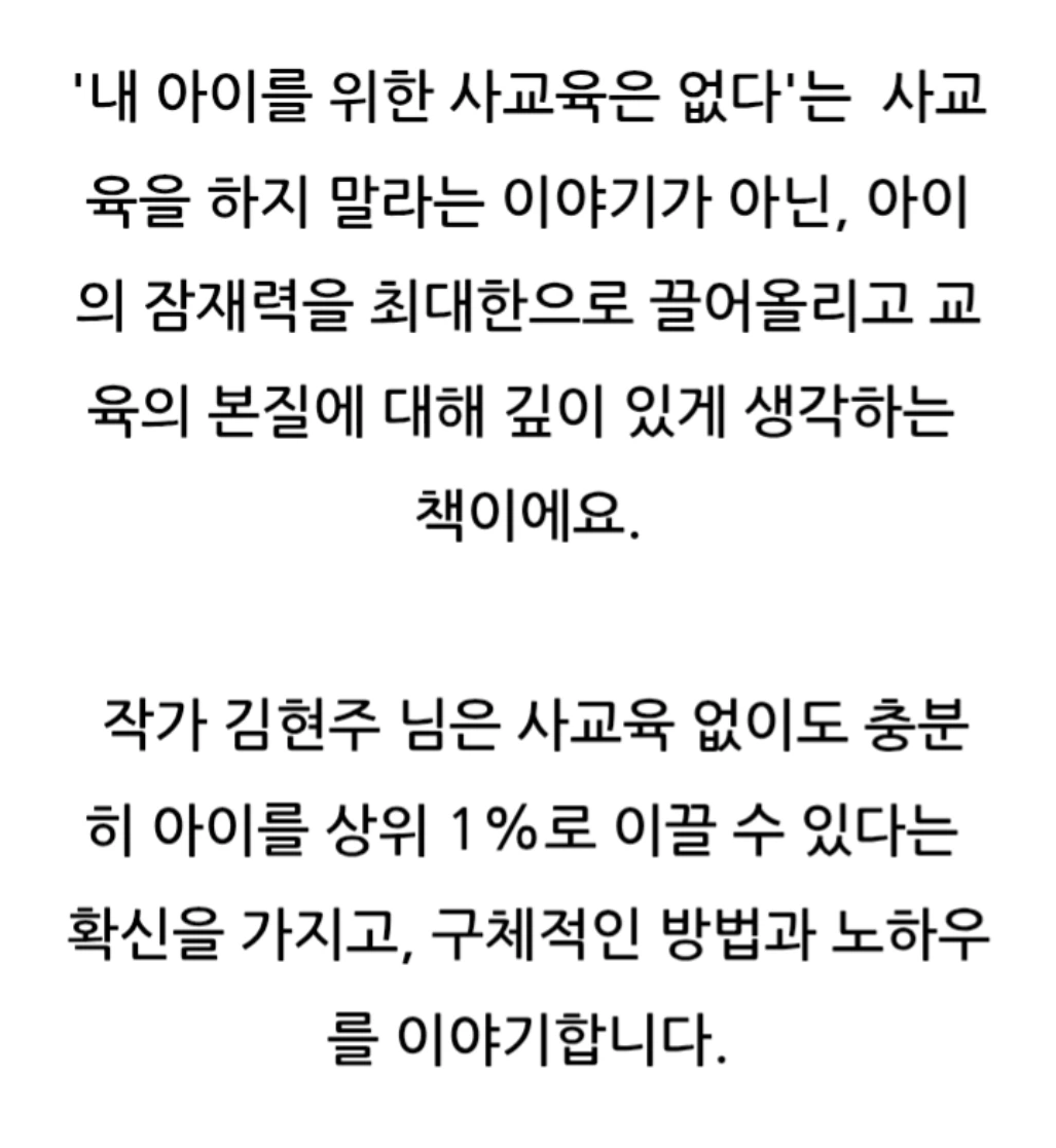 이 책은 사교육 없이 자녀를 과학고에 보낸 저자의 경험을 바탕으로, 부모의 역할과 가정 교육의 중요성을 강조해요.사교육 없이도 자녀를 최상위권으로 키울 수 있는 부모의 역할과 교육 노하우를 담고 있어요. 자녀의 잠재력을 최대한으로 이끌어내기 위한 부모의 마음가짐과 가정에서의 교육법을 제시합니다.
