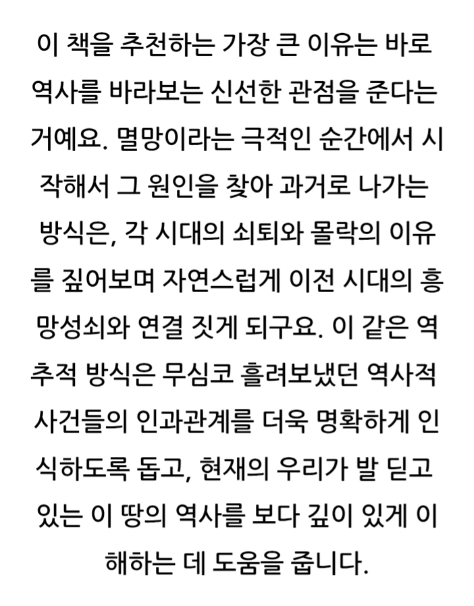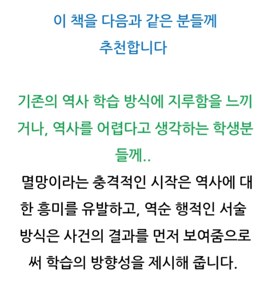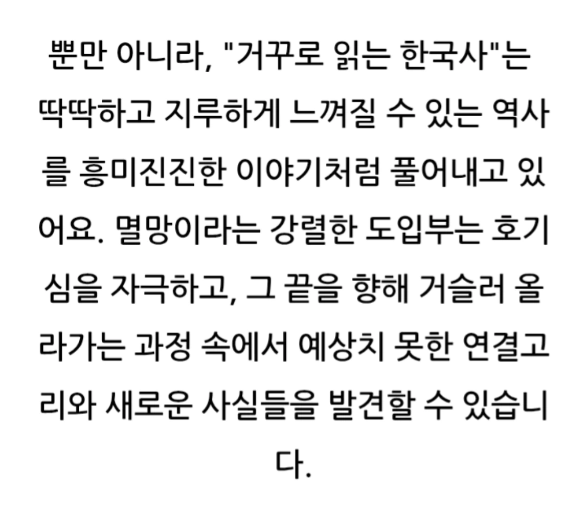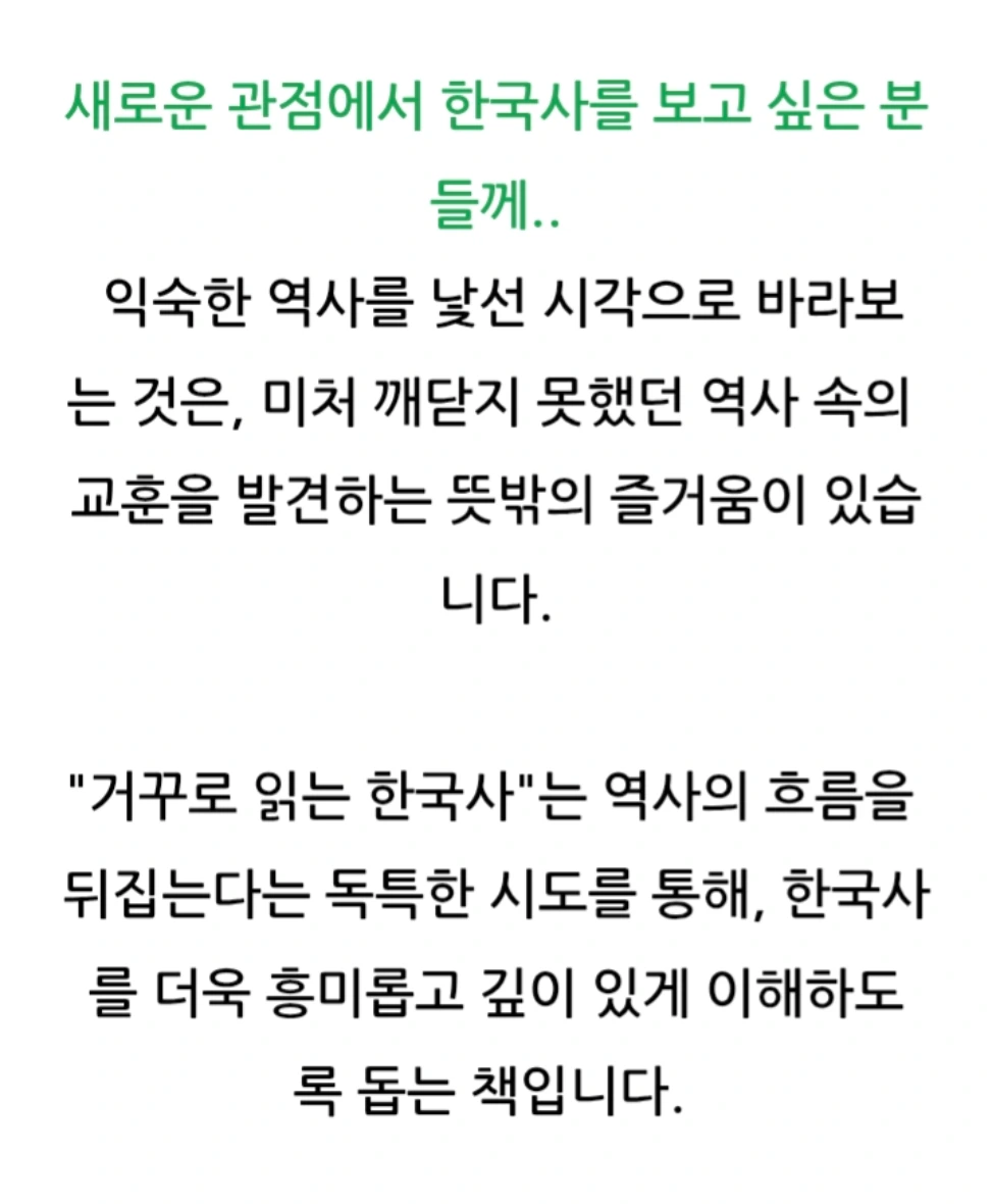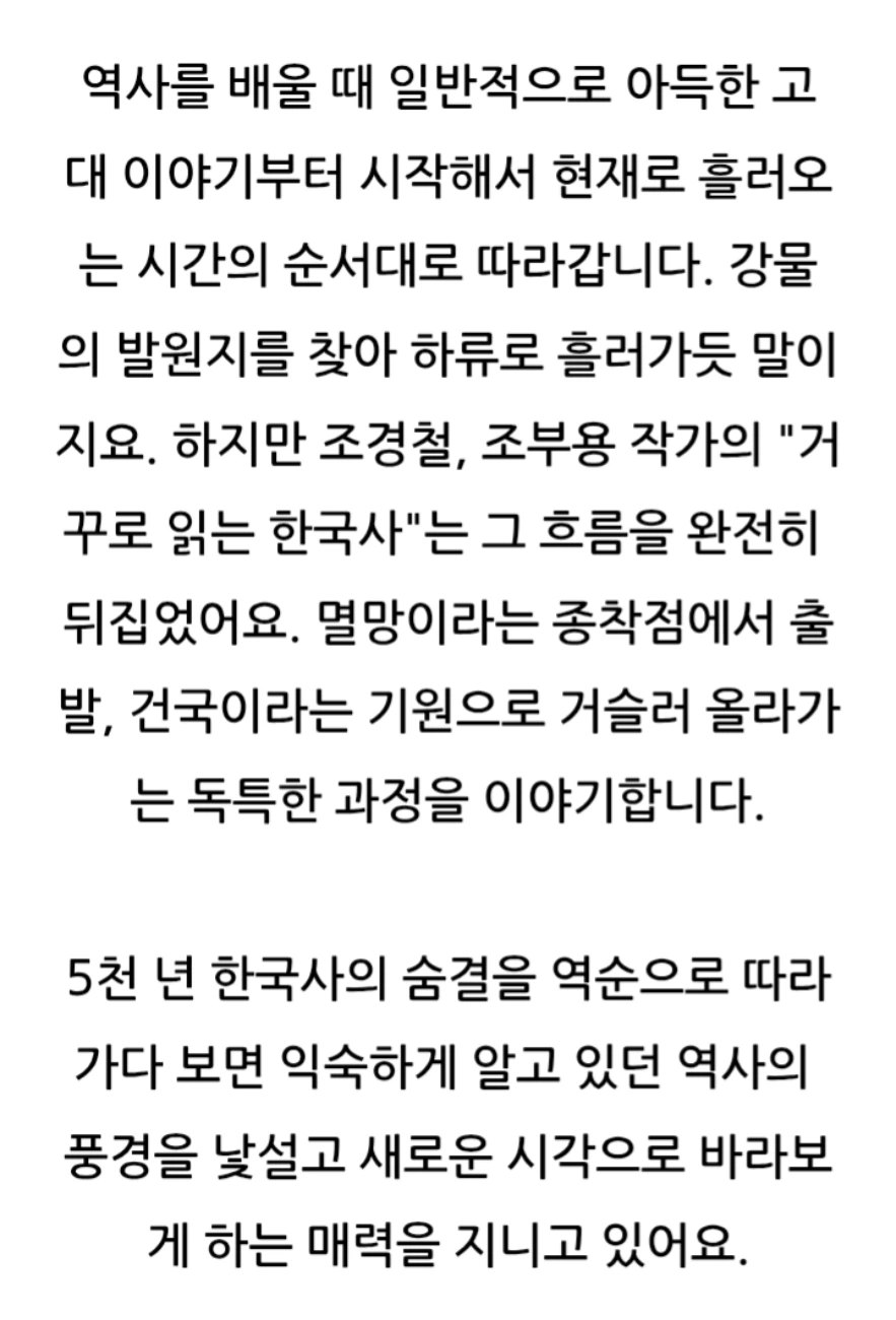 눈을 뗄 수 없는 역발상! 멸망에서 시작해서 건국으로 거슬러 올라가는 독특한 방식으로 5천 년 한국사를 새롭게 바라보고 있어요. 조경철, 조부용 작가의 흥미로운 시각이 담긴 한국사 이야기입니다.