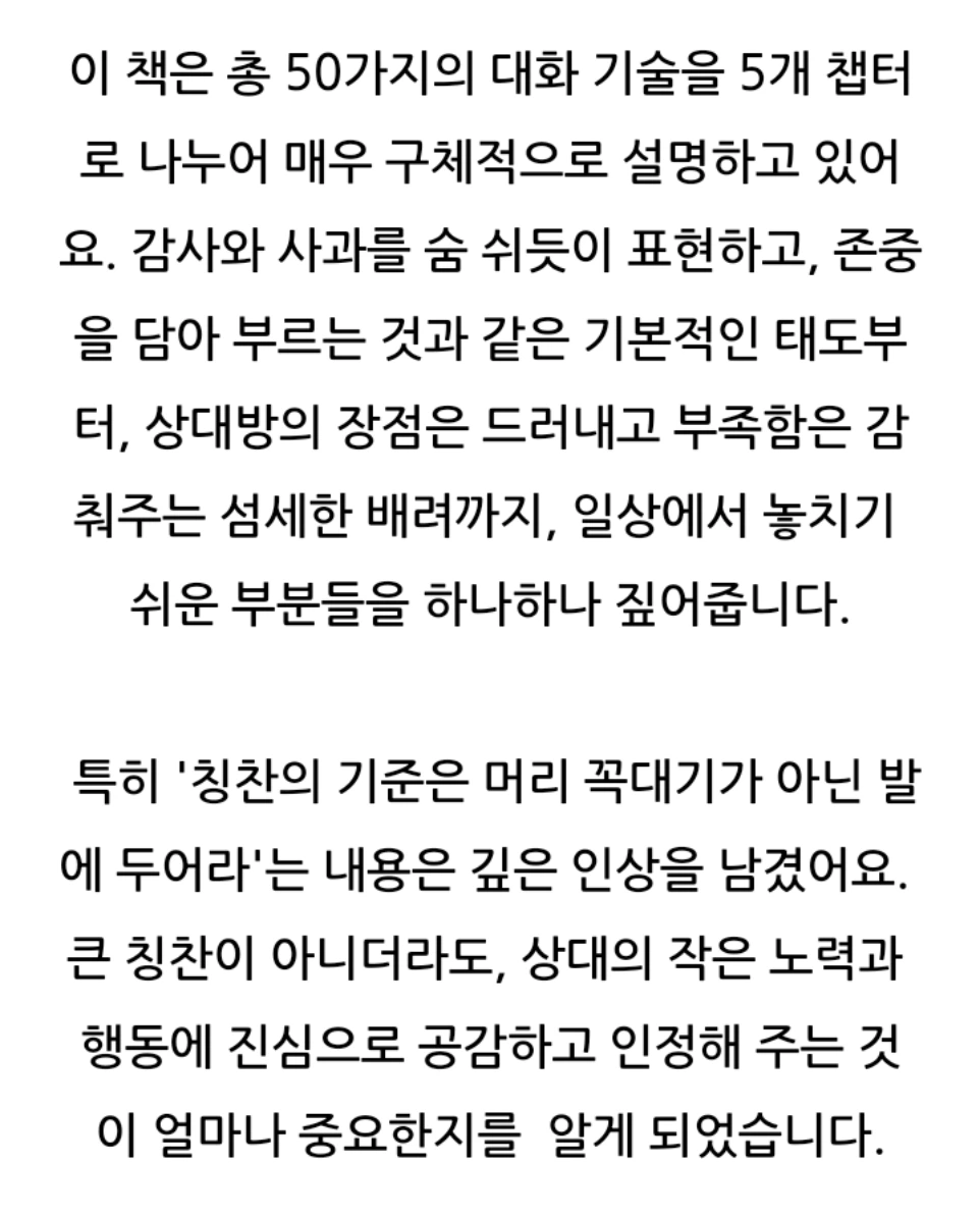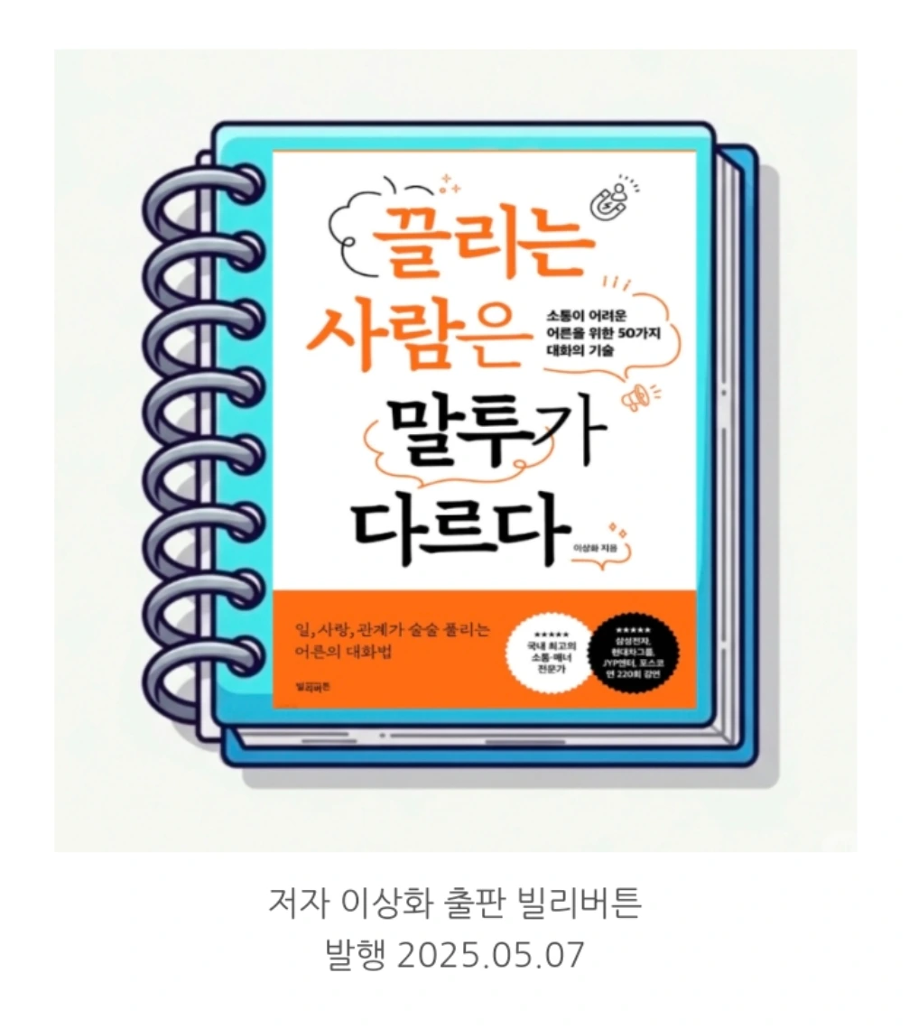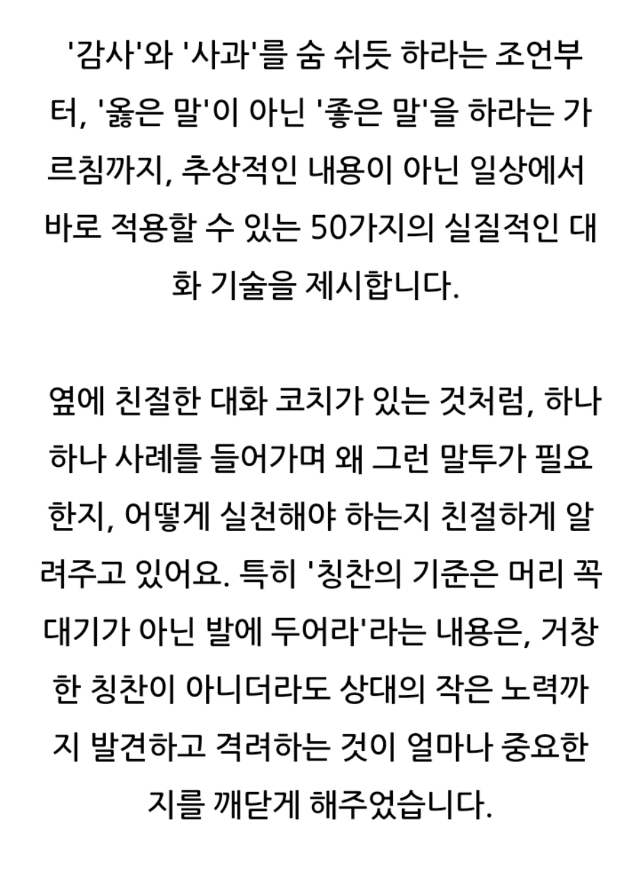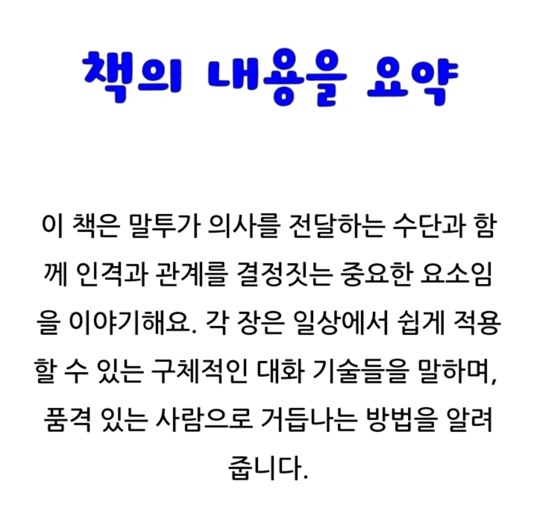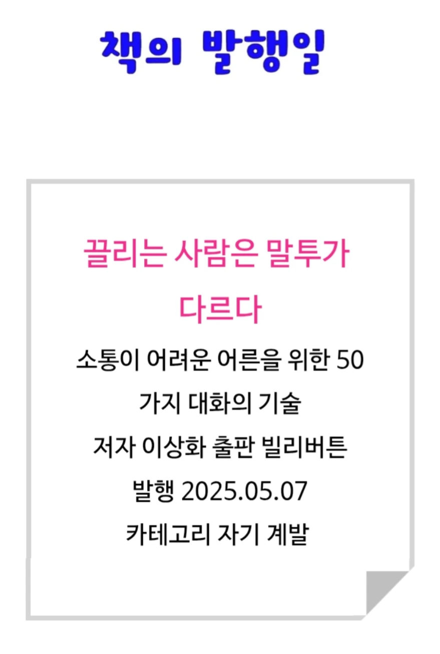 ➡️ 이상화 작가의 '끌리는 사람은 말투가 다르다, 소통이 어려운 어른을 위한 50가지 대화의 기술'은 어른들의 관계 속에서 겪는 대화의 어려움을 해결해 주는 자기 계발서에요. 이 책은 말투만 바꿔도 마음을 얻고 관계를 개선할 수 있다는 것을 보여주며, 실생활에 바로 적용할 수 있는 50가지의 실용적인 대화 기술을 제시합니다.