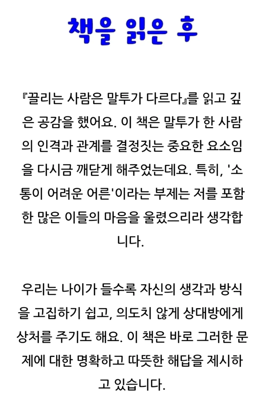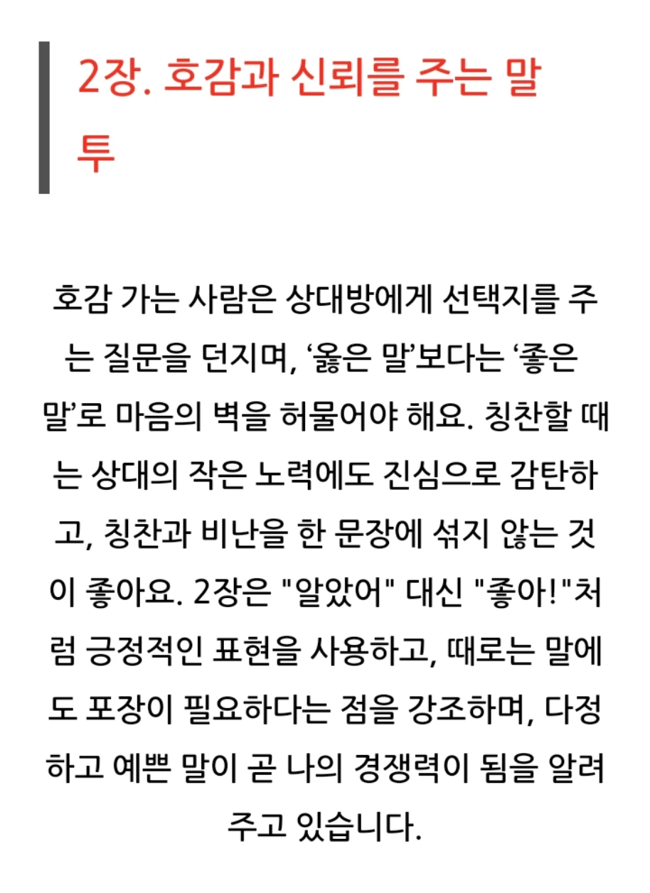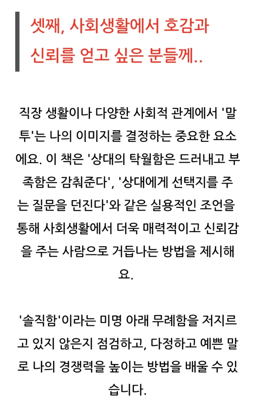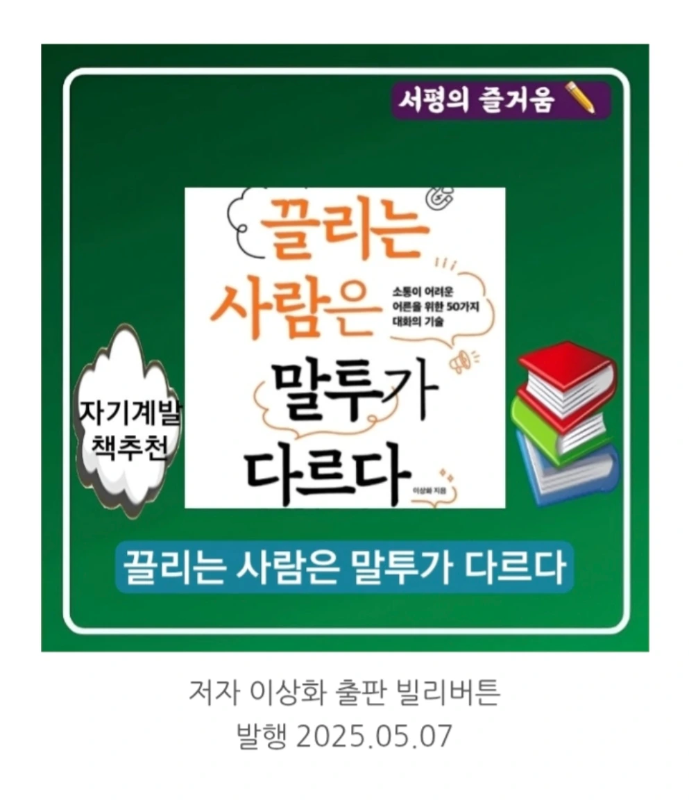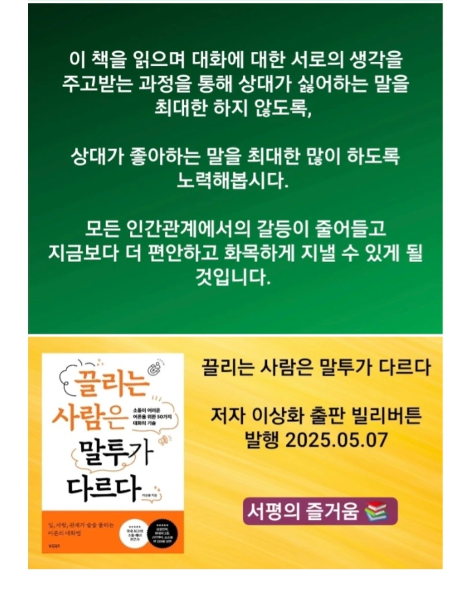 ➡️ 이상화 작가의 '끌리는 사람은 말투가 다르다, 소통이 어려운 어른을 위한 50가지 대화의 기술'은 어른들의 관계 속에서 겪는 대화의 어려움을 해결해 주는 자기 계발서에요. 이 책은 말투만 바꿔도 마음을 얻고 관계를 개선할 수 있다는 것을 보여주며, 실생활에 바로 적용할 수 있는 50가지의 실용적인 대화 기술을 제시합니다.