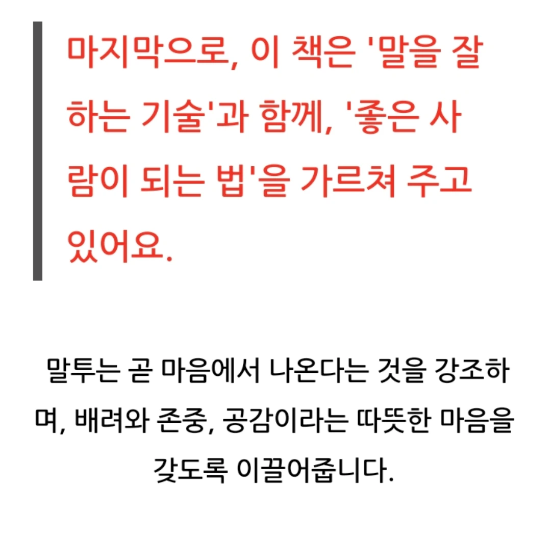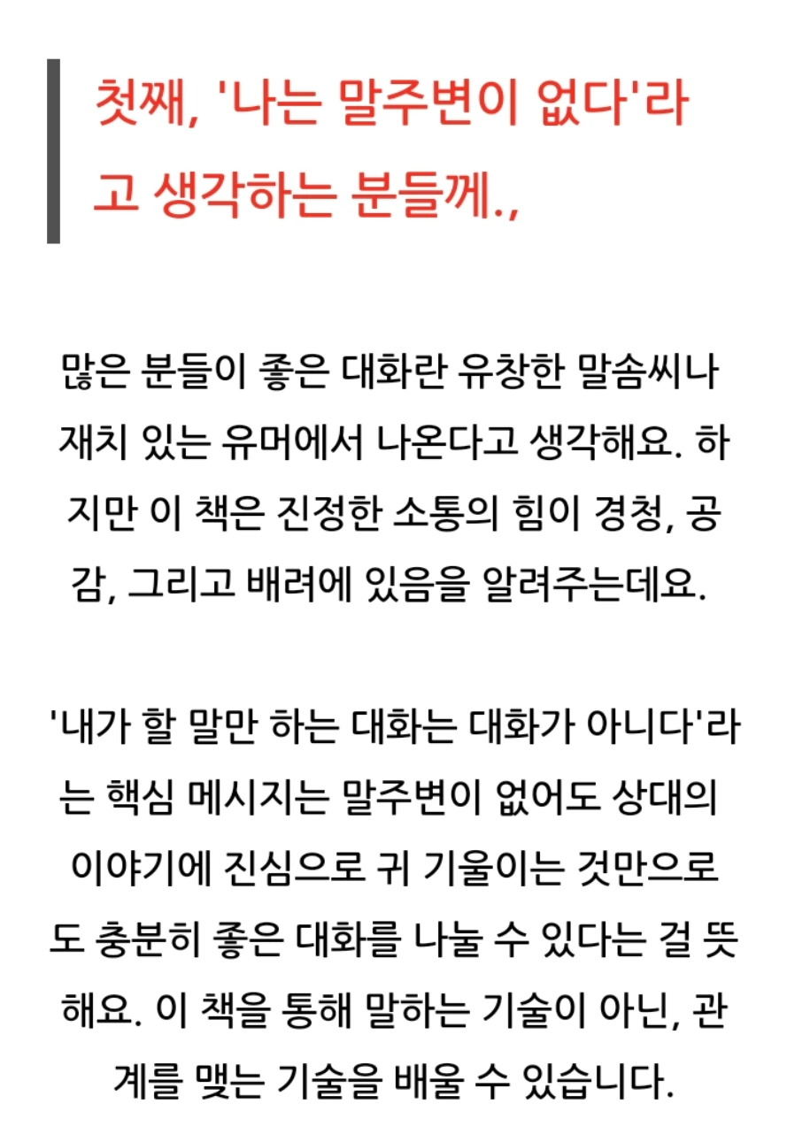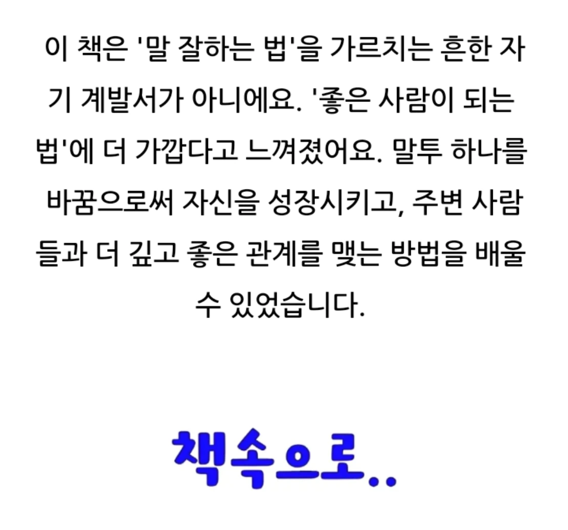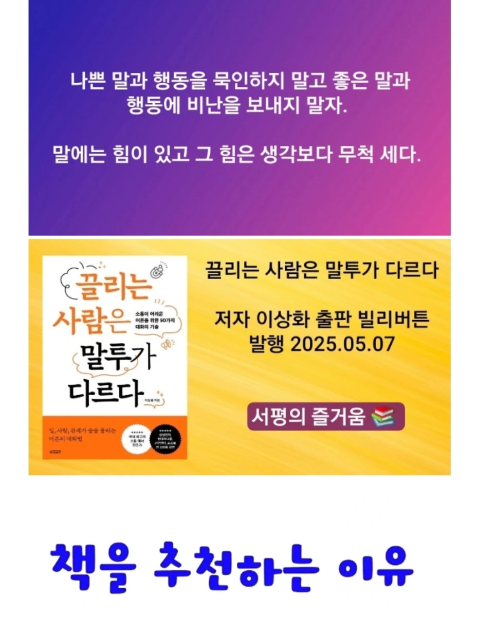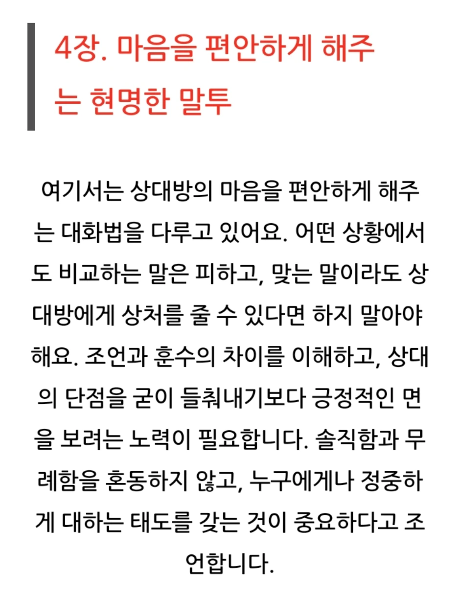 ➡️ 이상화 작가의 '끌리는 사람은 말투가 다르다, 소통이 어려운 어른을 위한 50가지 대화의 기술'은 어른들의 관계 속에서 겪는 대화의 어려움을 해결해 주는 자기 계발서에요. 이 책은 말투만 바꿔도 마음을 얻고 관계를 개선할 수 있다는 것을 보여주며, 실생활에 바로 적용할 수 있는 50가지의 실용적인 대화 기술을 제시합니다.