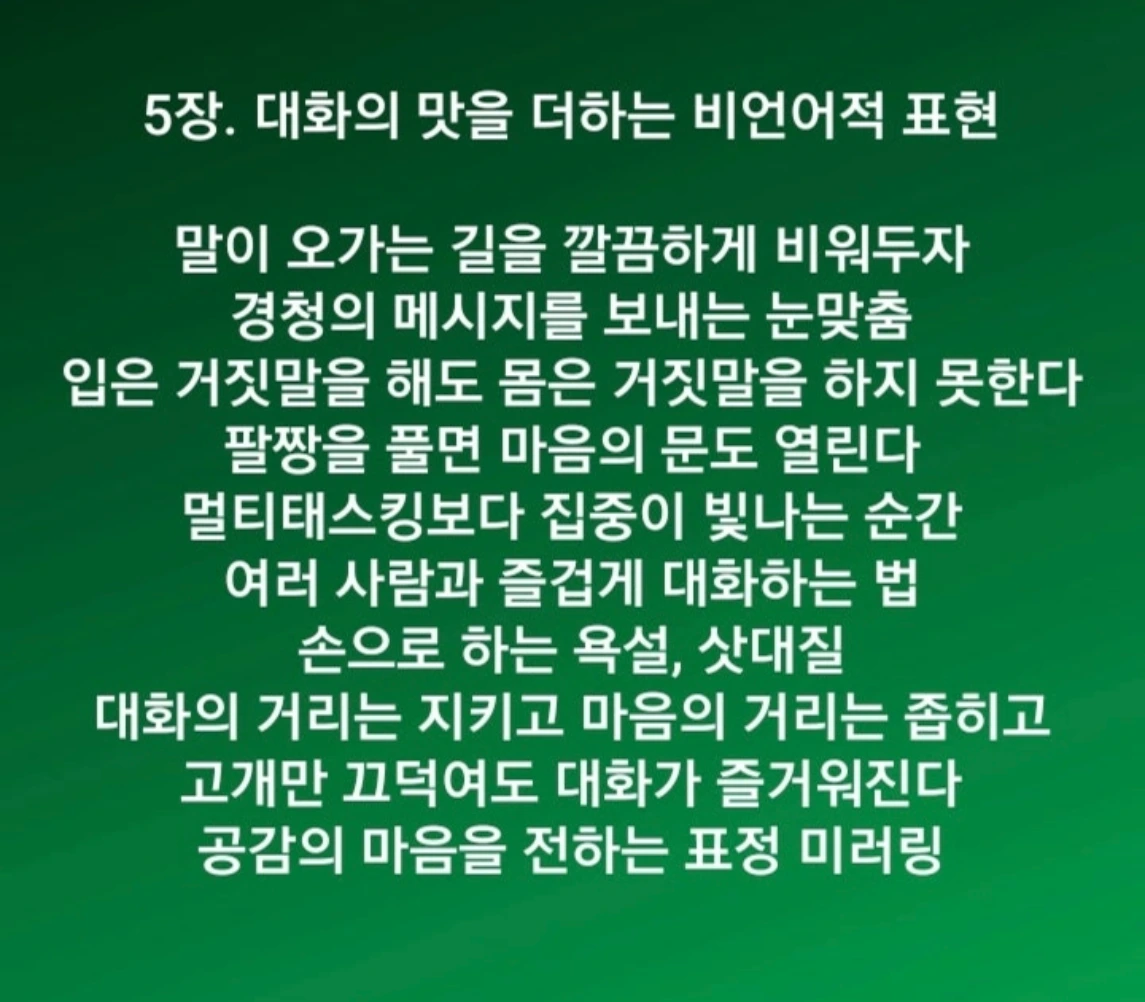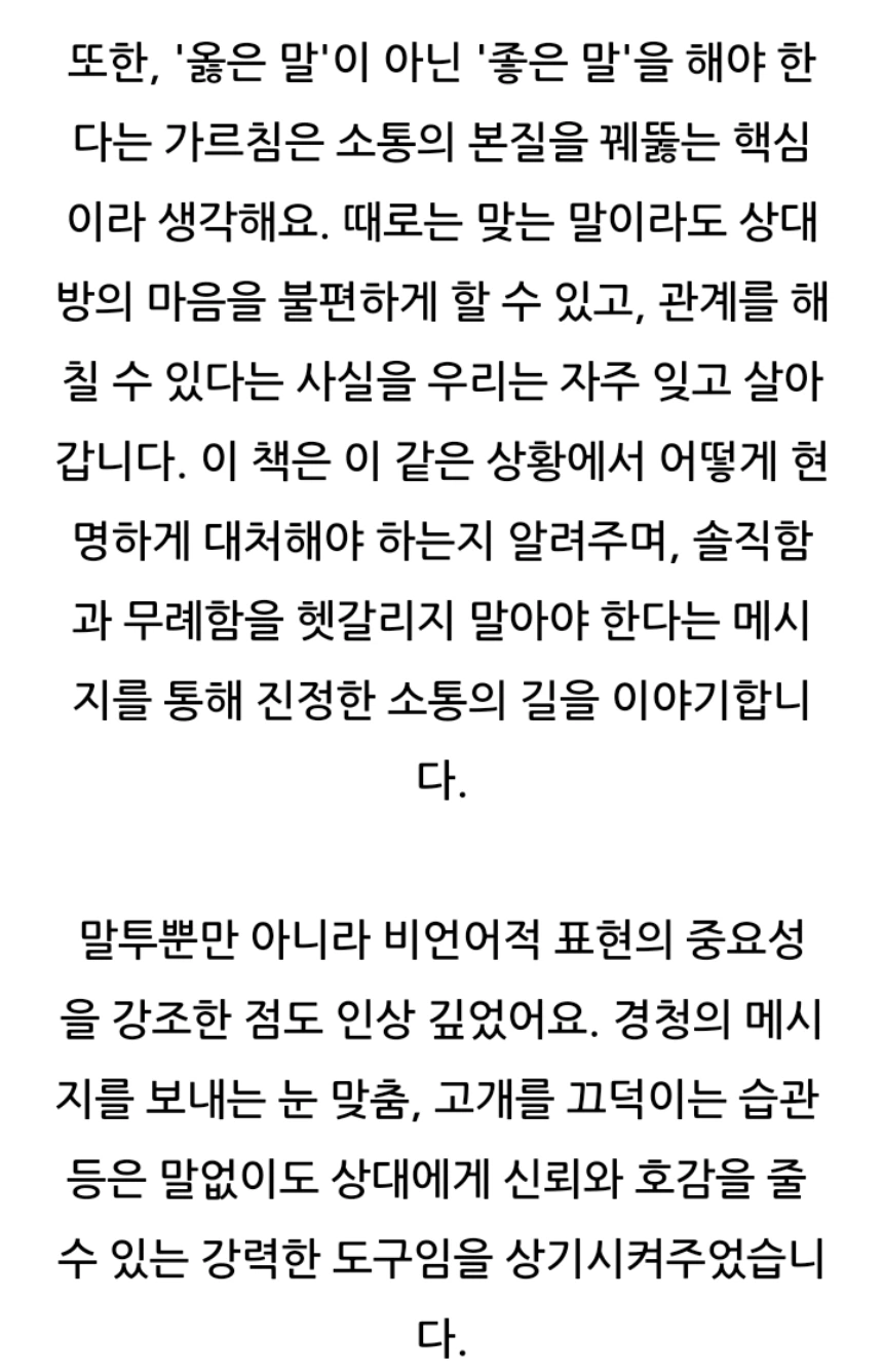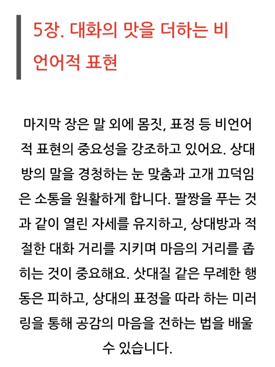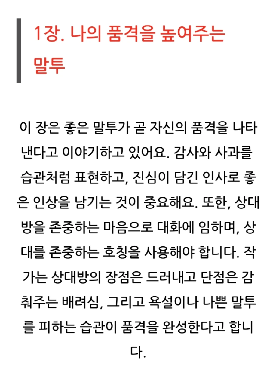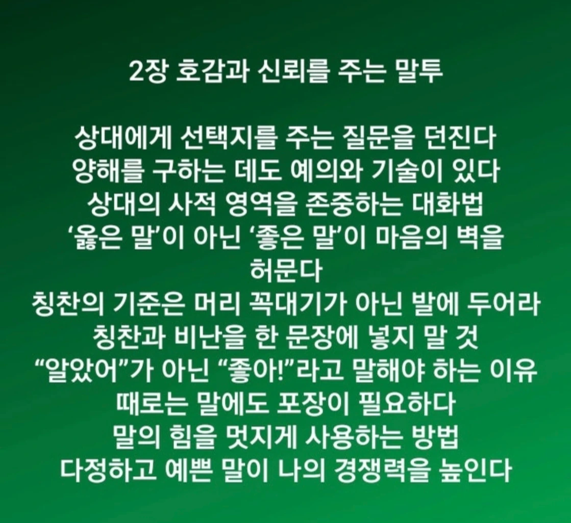 ➡️ 이상화 작가의 '끌리는 사람은 말투가 다르다, 소통이 어려운 어른을 위한 50가지 대화의 기술'은 어른들의 관계 속에서 겪는 대화의 어려움을 해결해 주는 자기 계발서에요. 이 책은 말투만 바꿔도 마음을 얻고 관계를 개선할 수 있다는 것을 보여주며, 실생활에 바로 적용할 수 있는 50가지의 실용적인 대화 기술을 제시합니다.