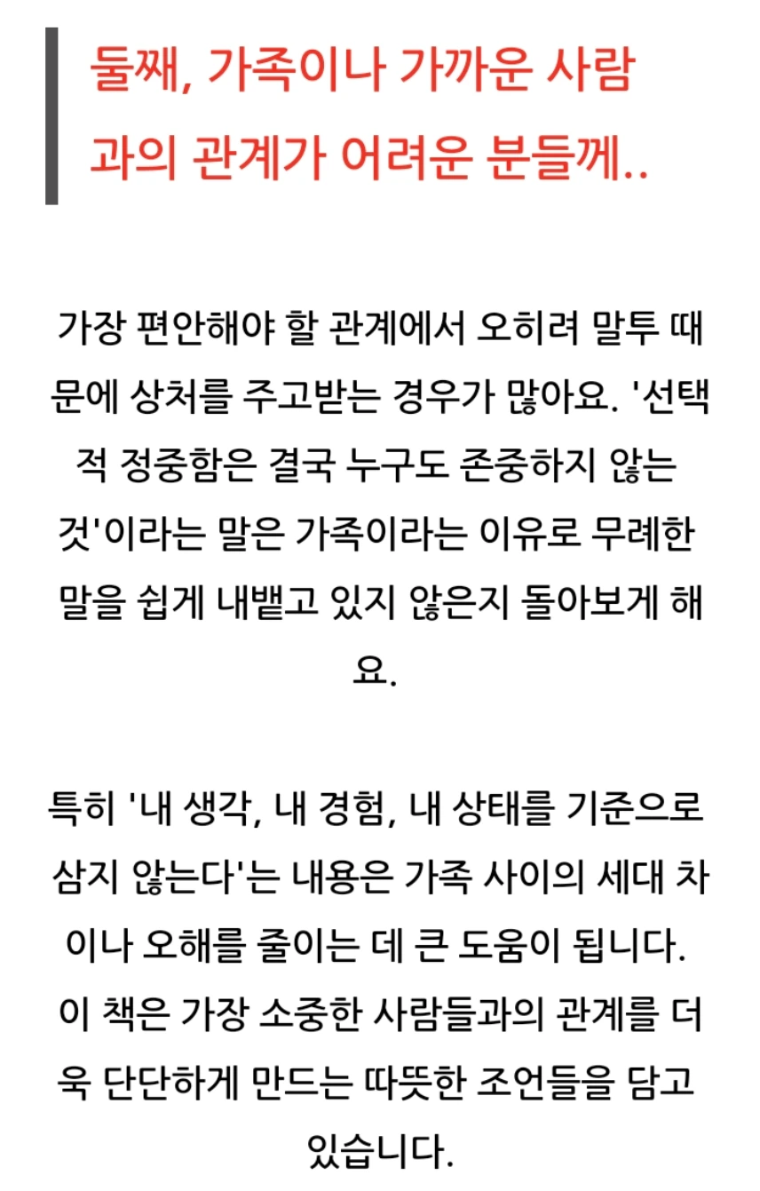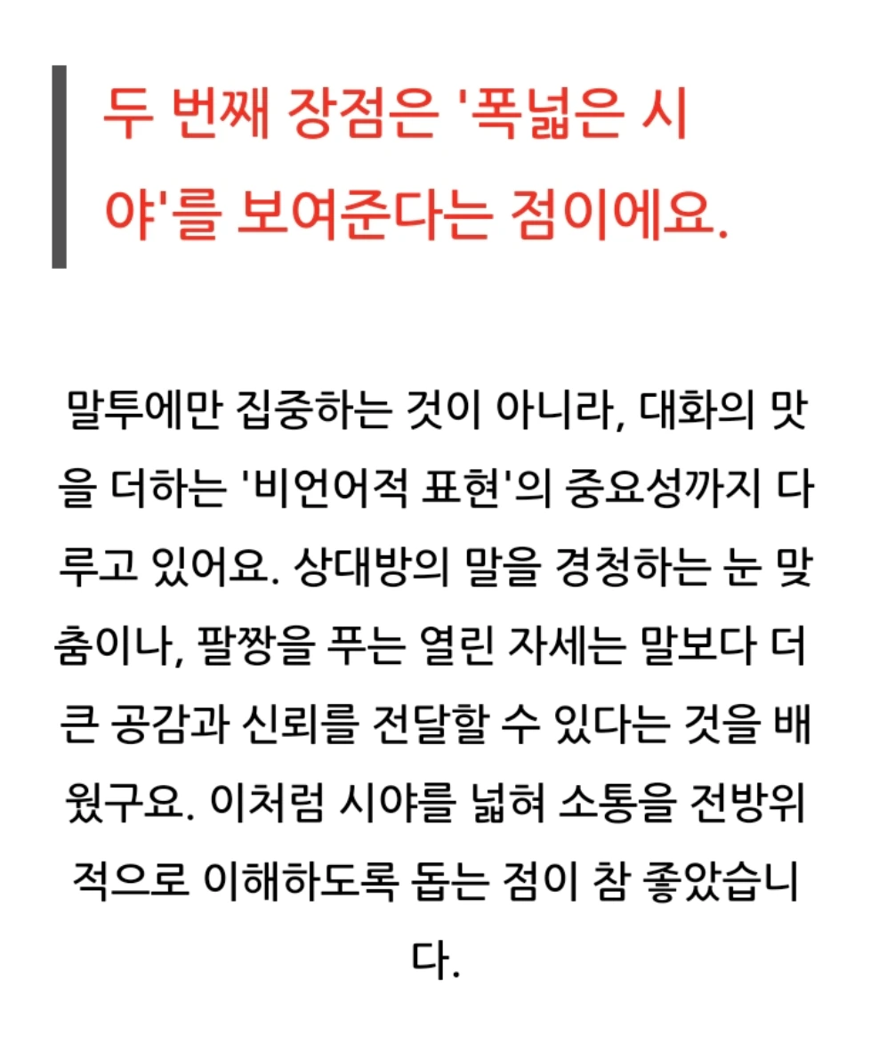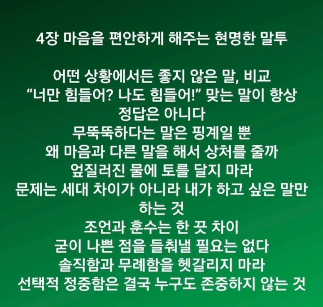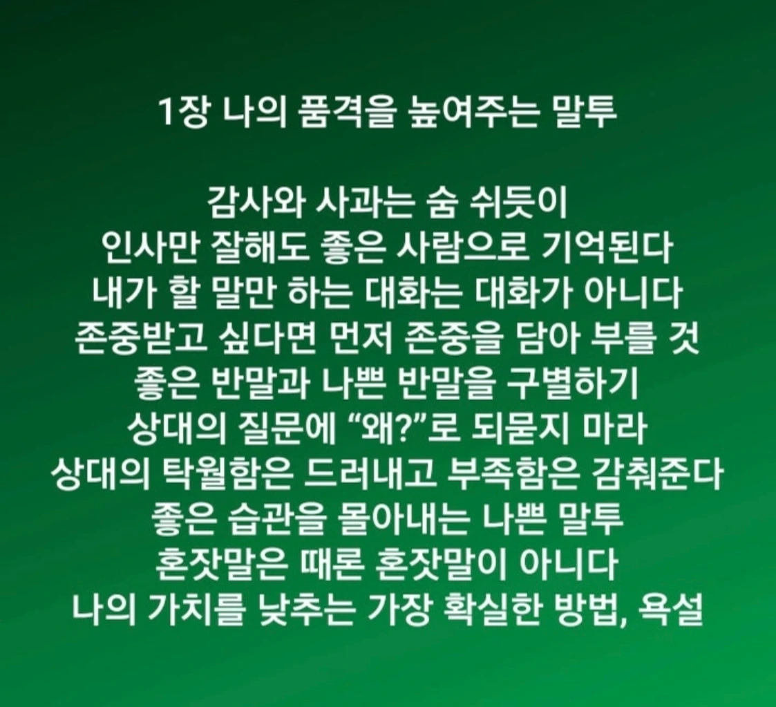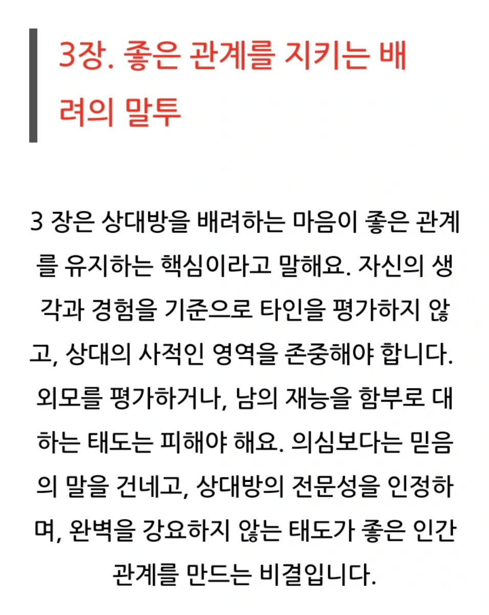 ➡️ 이상화 작가의 '끌리는 사람은 말투가 다르다, 소통이 어려운 어른을 위한 50가지 대화의 기술'은 어른들의 관계 속에서 겪는 대화의 어려움을 해결해 주는 자기 계발서에요. 이 책은 말투만 바꿔도 마음을 얻고 관계를 개선할 수 있다는 것을 보여주며, 실생활에 바로 적용할 수 있는 50가지의 실용적인 대화 기술을 제시합니다.