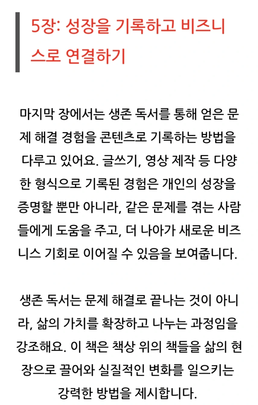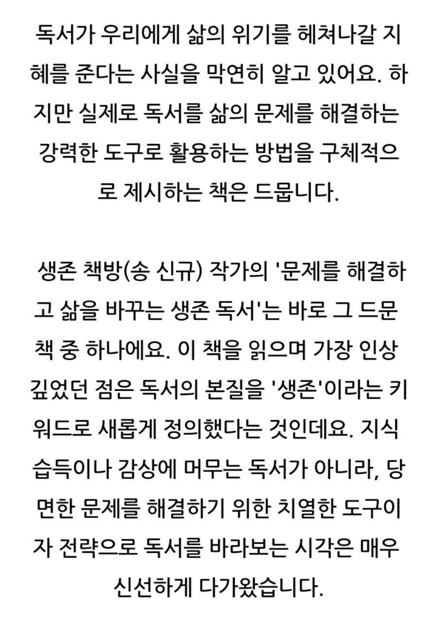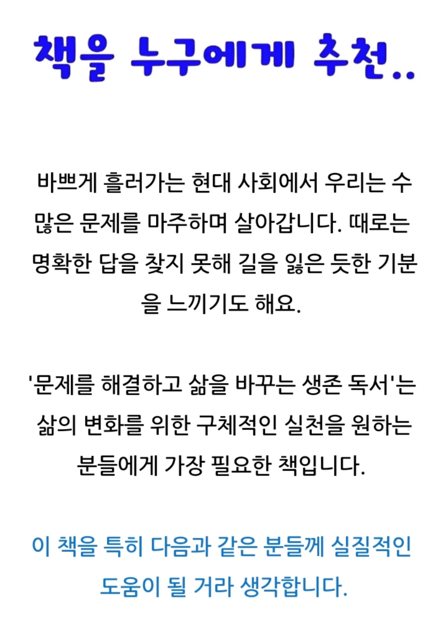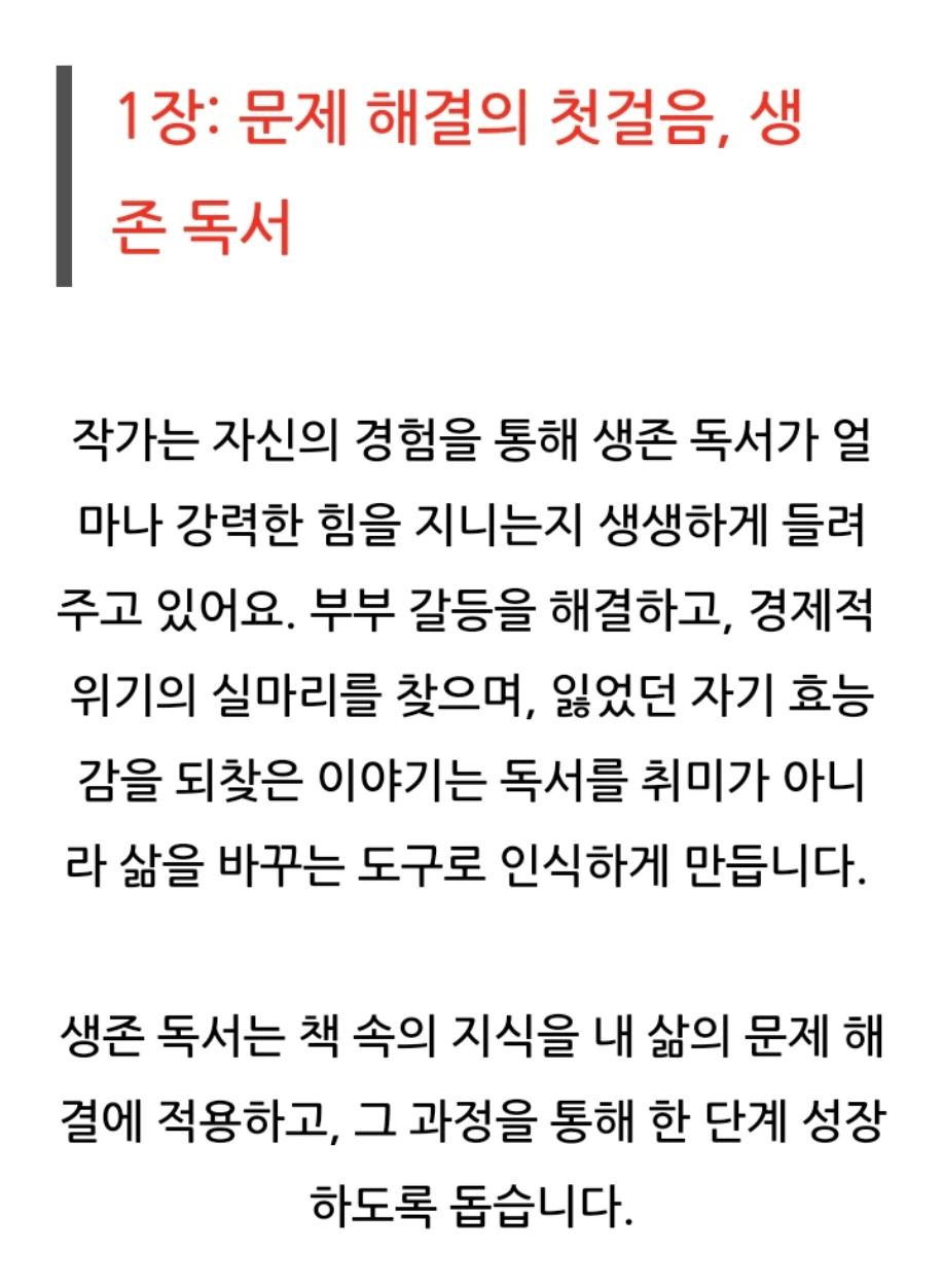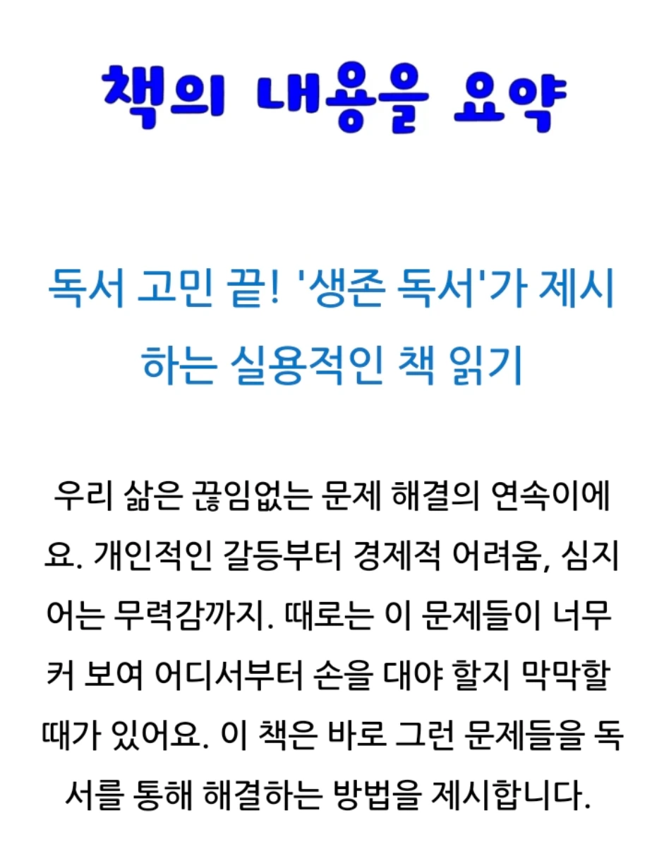 ➡️ 《문제를 해결하고 삶을 바꾸는 생존 독서》는 삶의 문제를 해결하고 변화를 이끌어내는 독서법을 알려주는 자기 계발서에요.