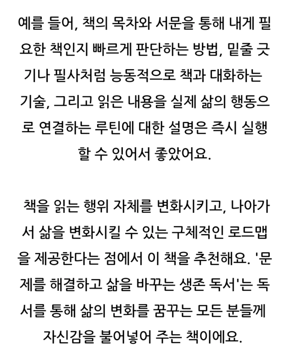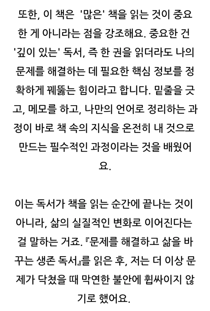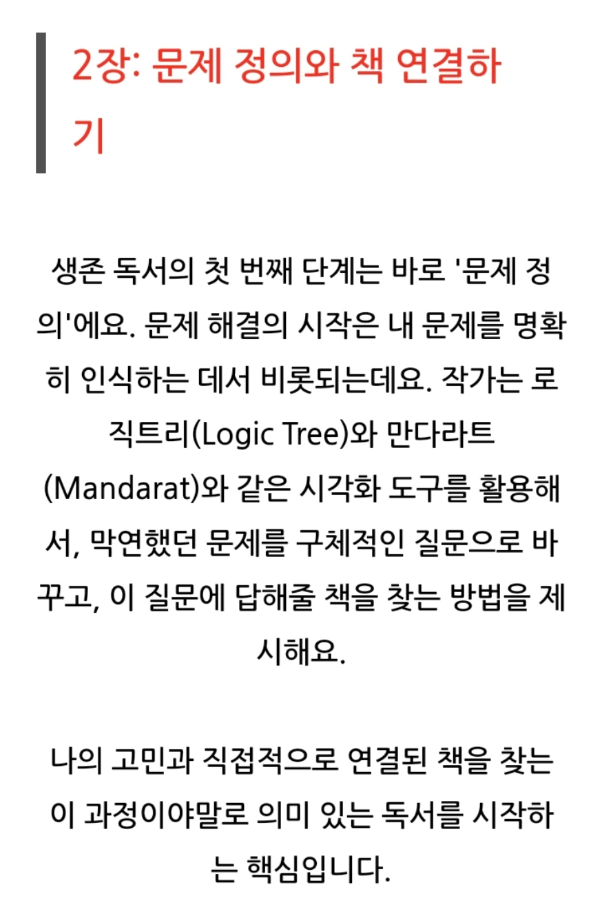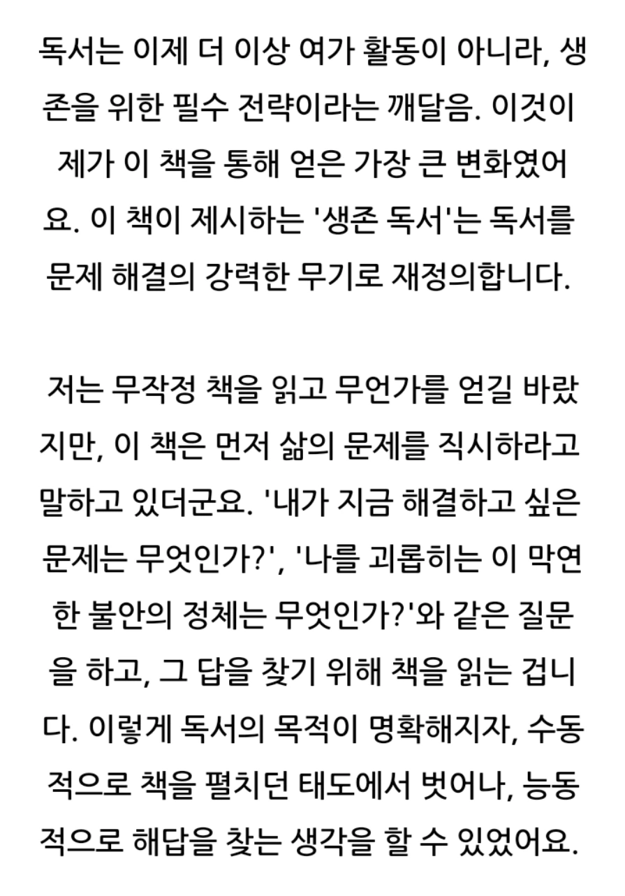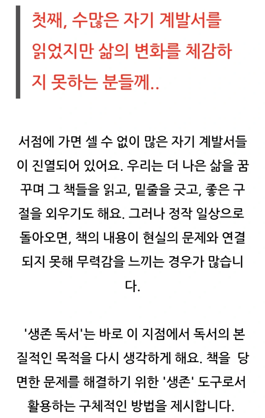 ➡️ 《문제를 해결하고 삶을 바꾸는 생존 독서》는 삶의 문제를 해결하고 변화를 이끌어내는 독서법을 알려주는 자기 계발서에요.