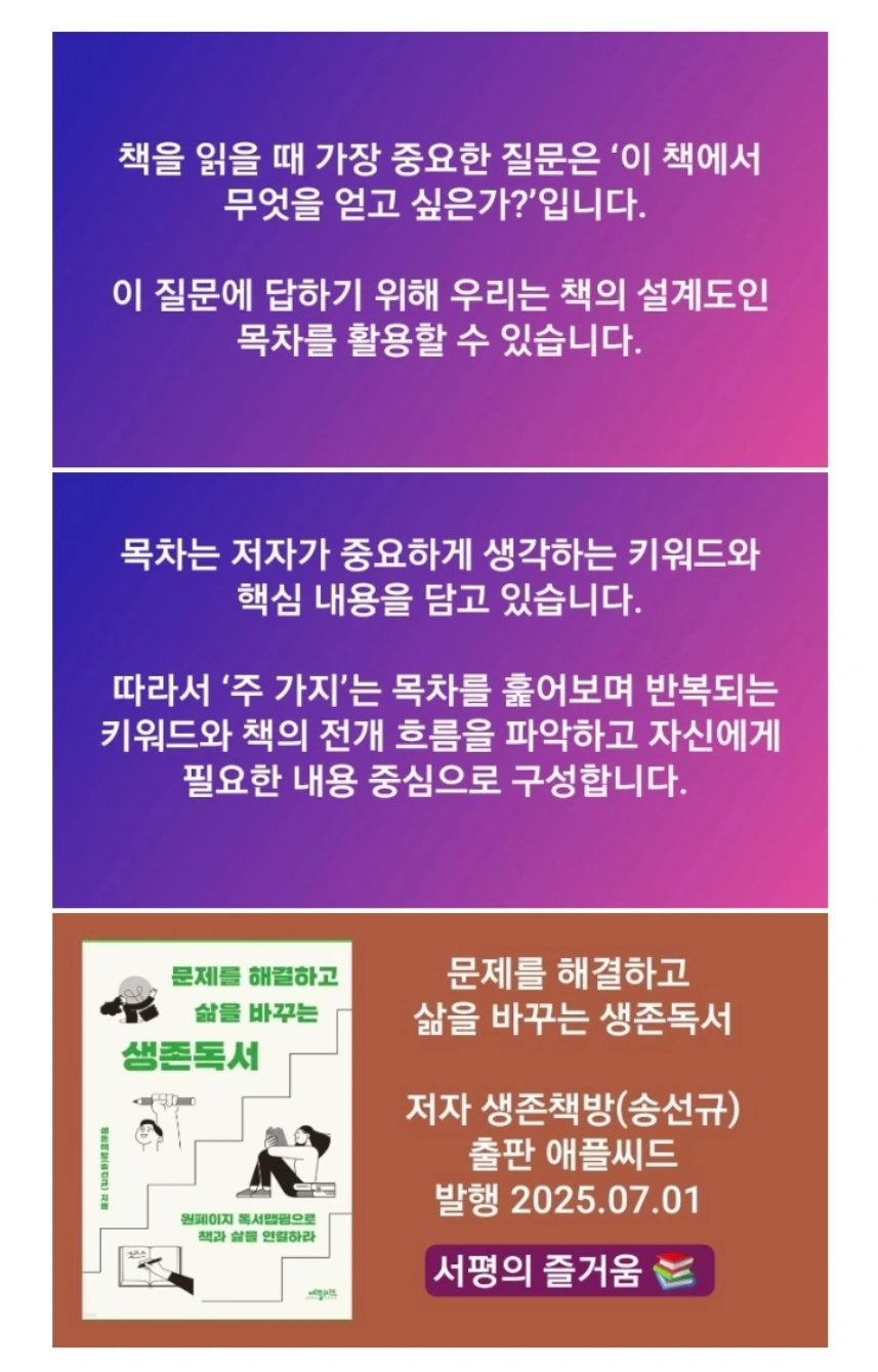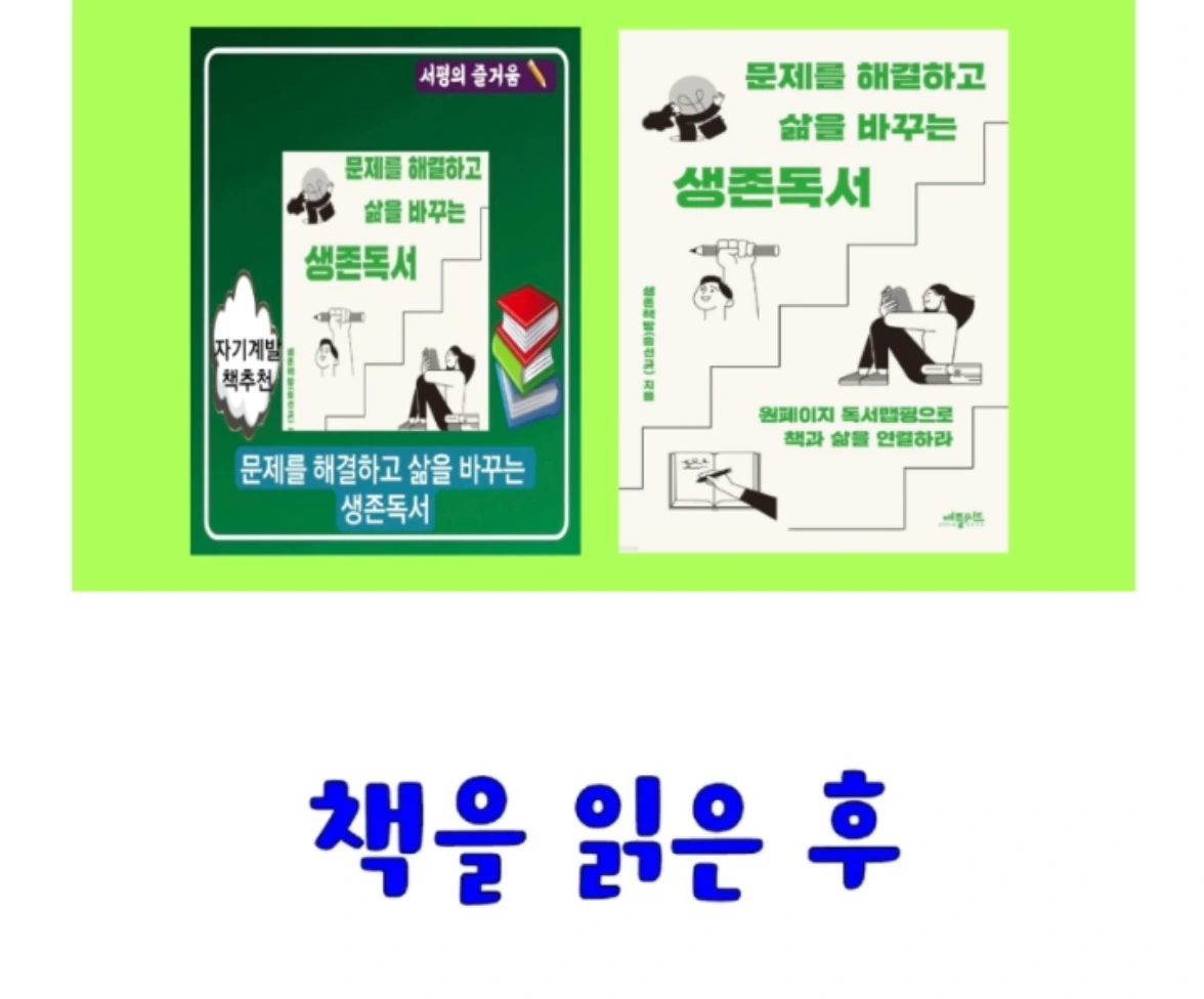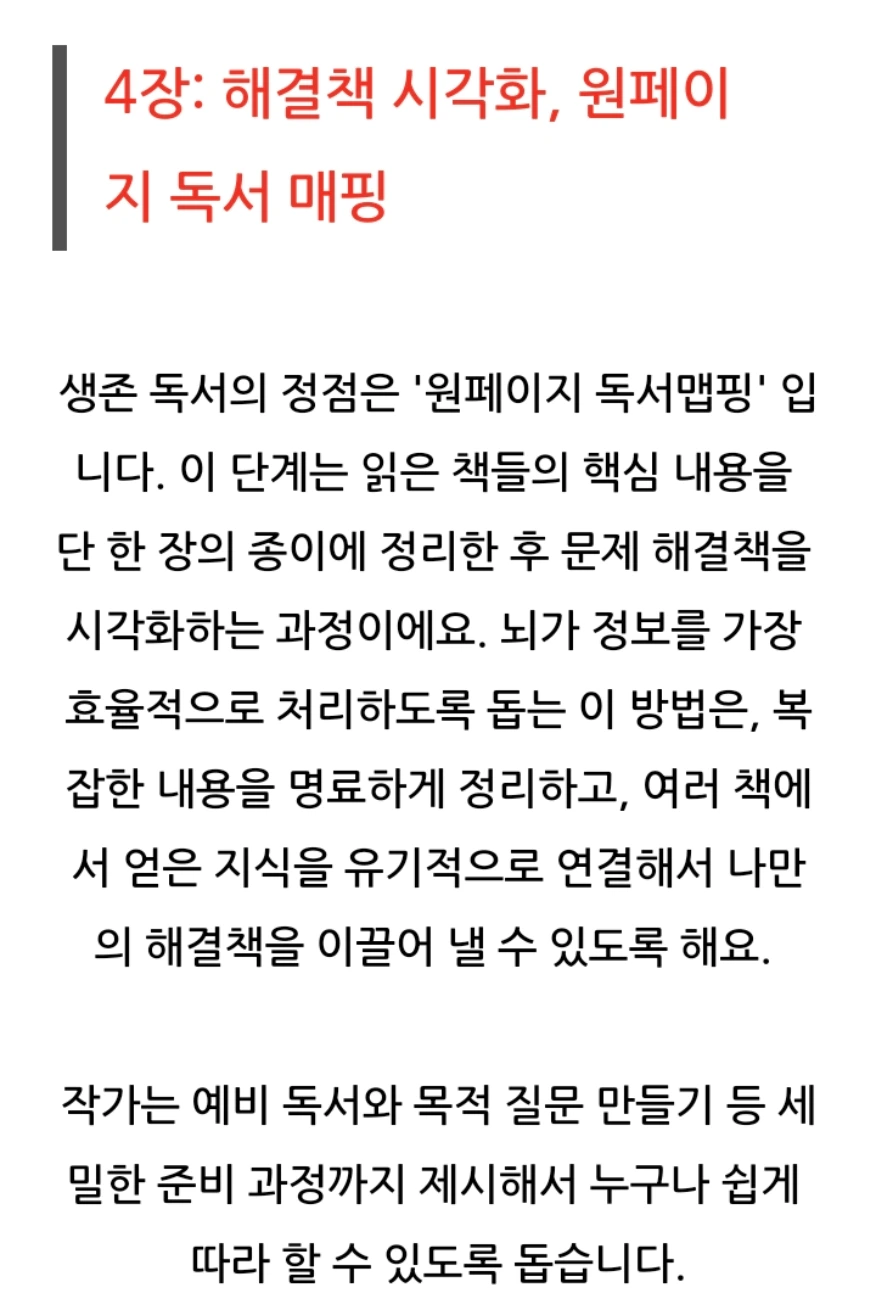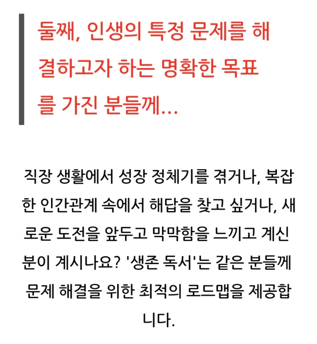 ➡️ 《문제를 해결하고 삶을 바꾸는 생존 독서》는 삶의 문제를 해결하고 변화를 이끌어내는 독서법을 알려주는 자기 계발서에요.