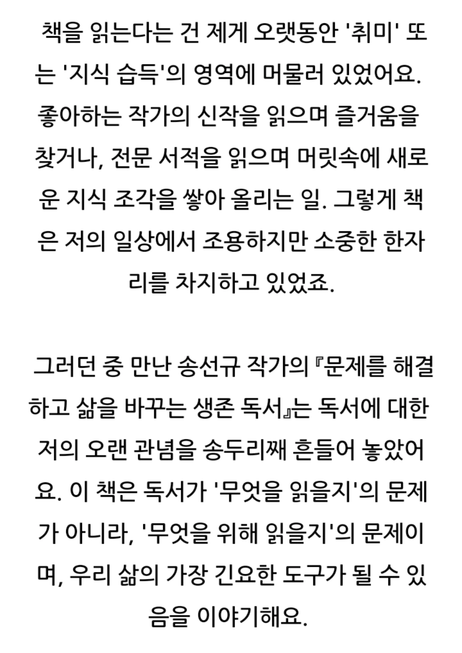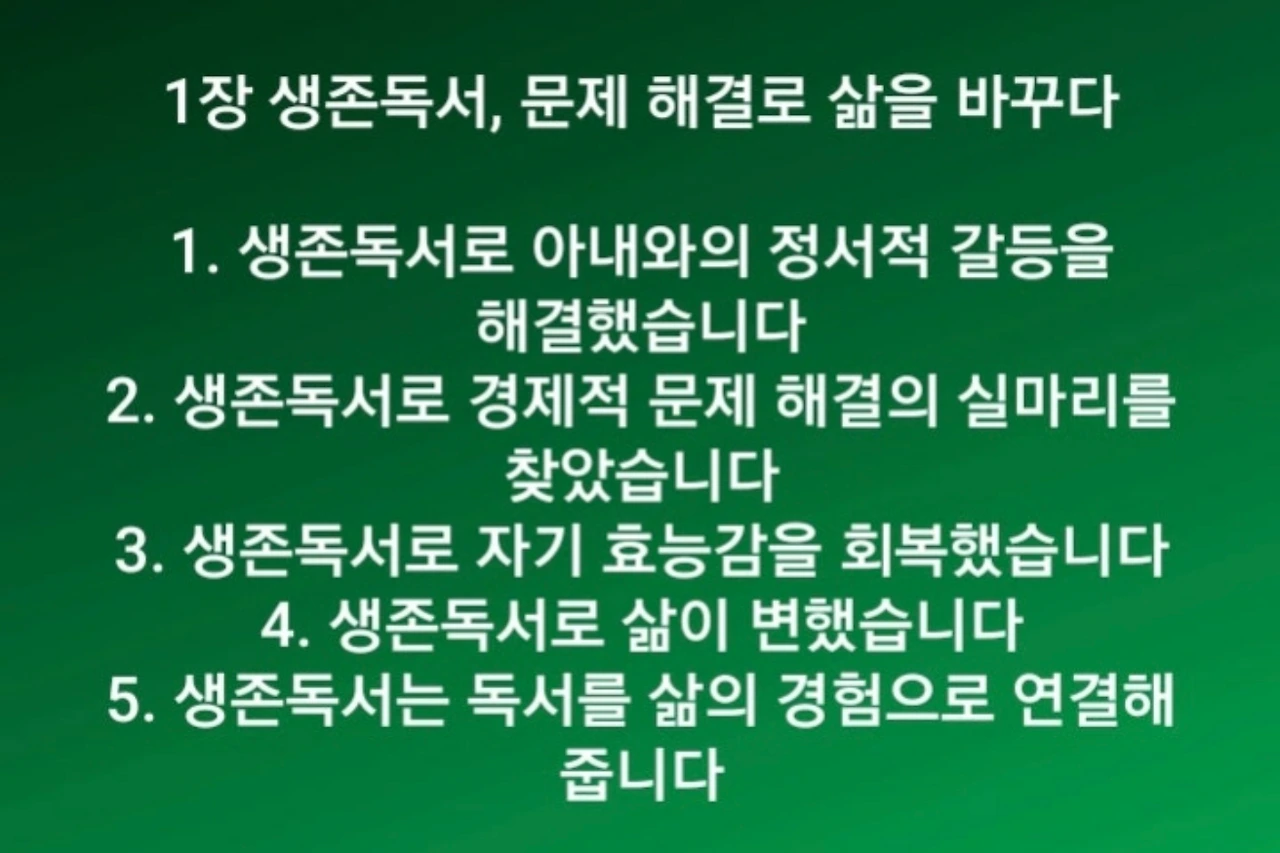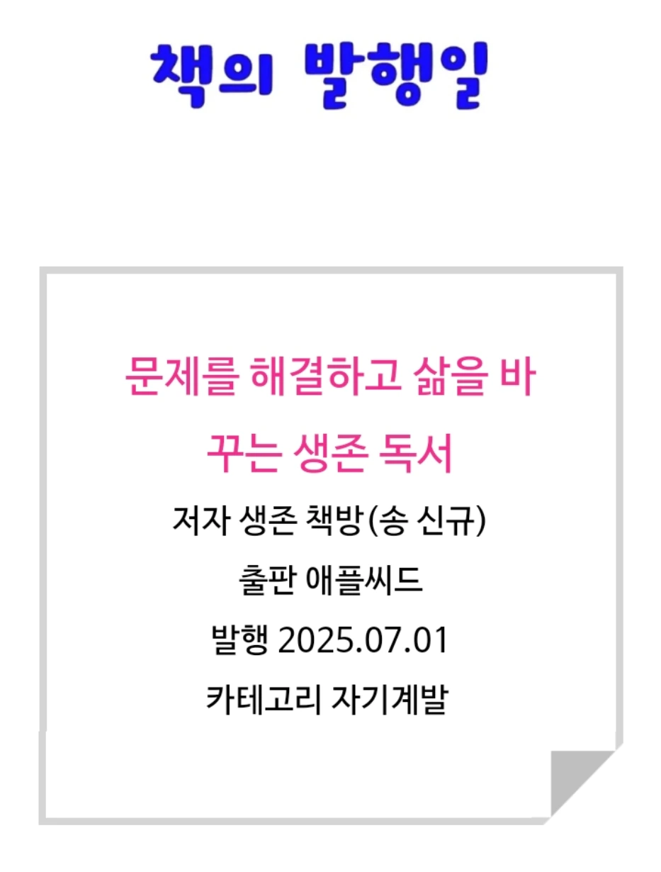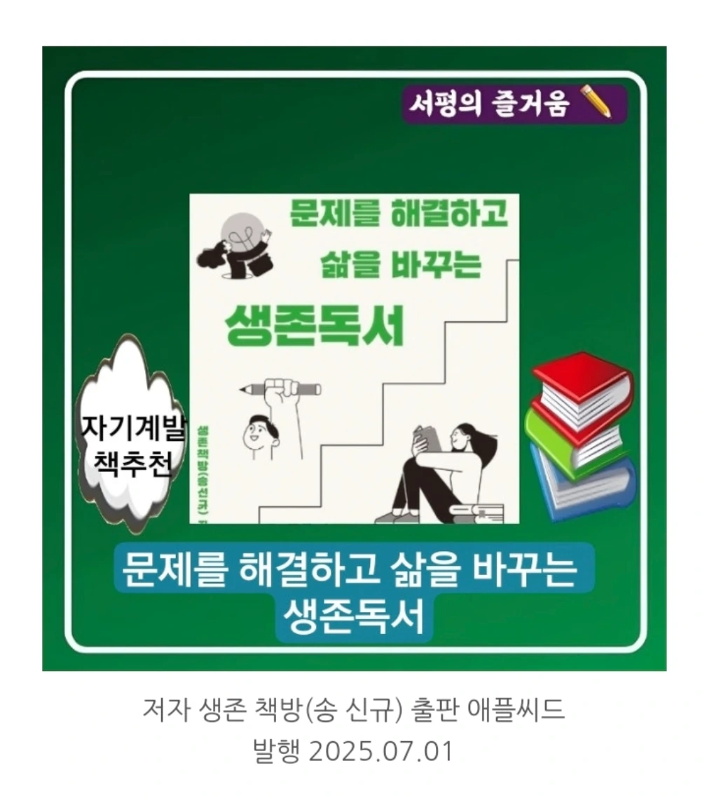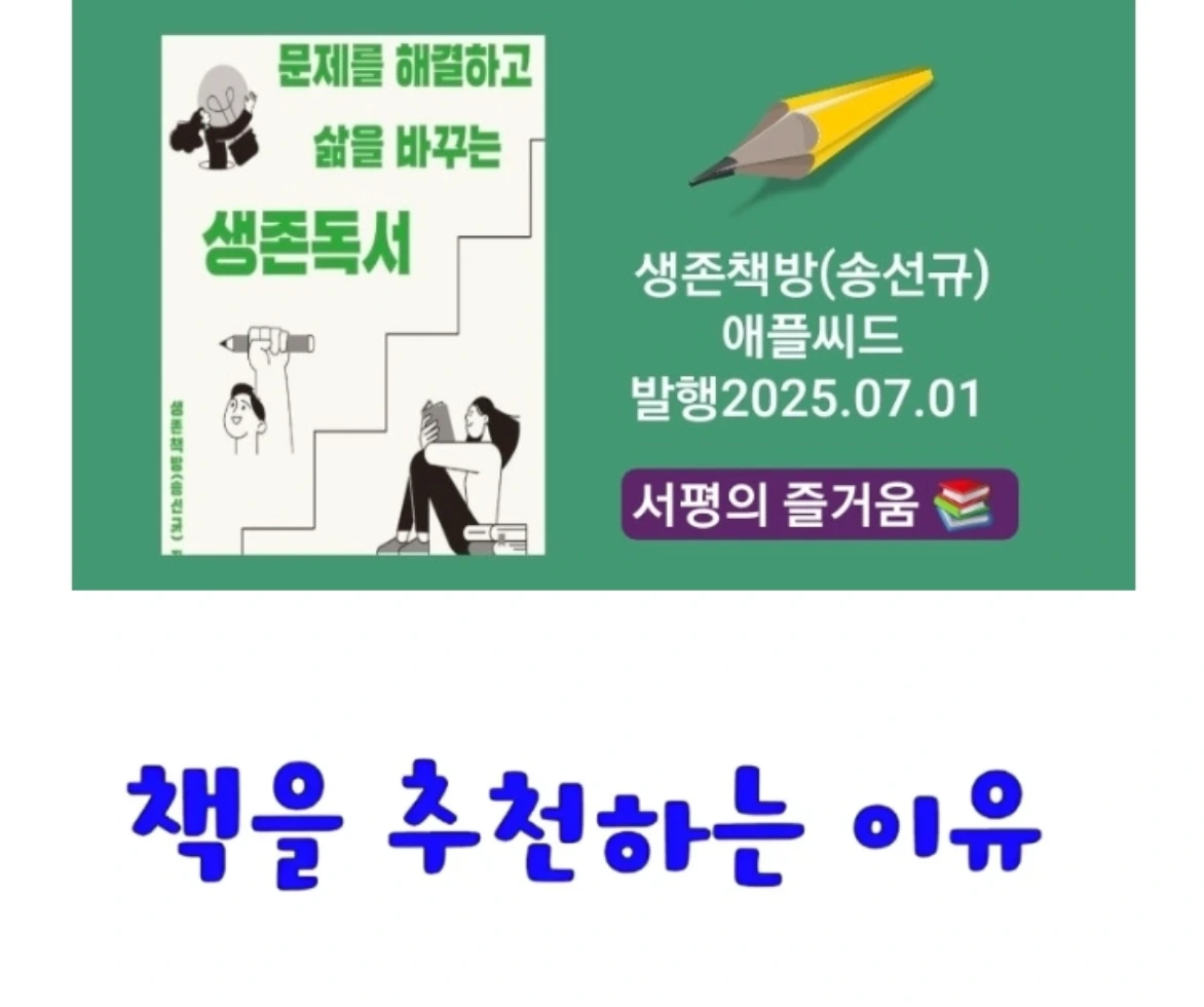 ➡️ 《문제를 해결하고 삶을 바꾸는 생존 독서》는 삶의 문제를 해결하고 변화를 이끌어내는 독서법을 알려주는 자기 계발서에요.