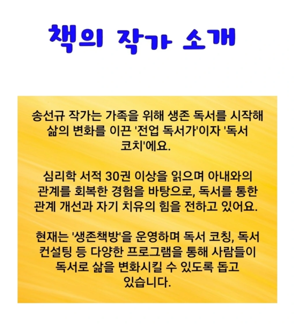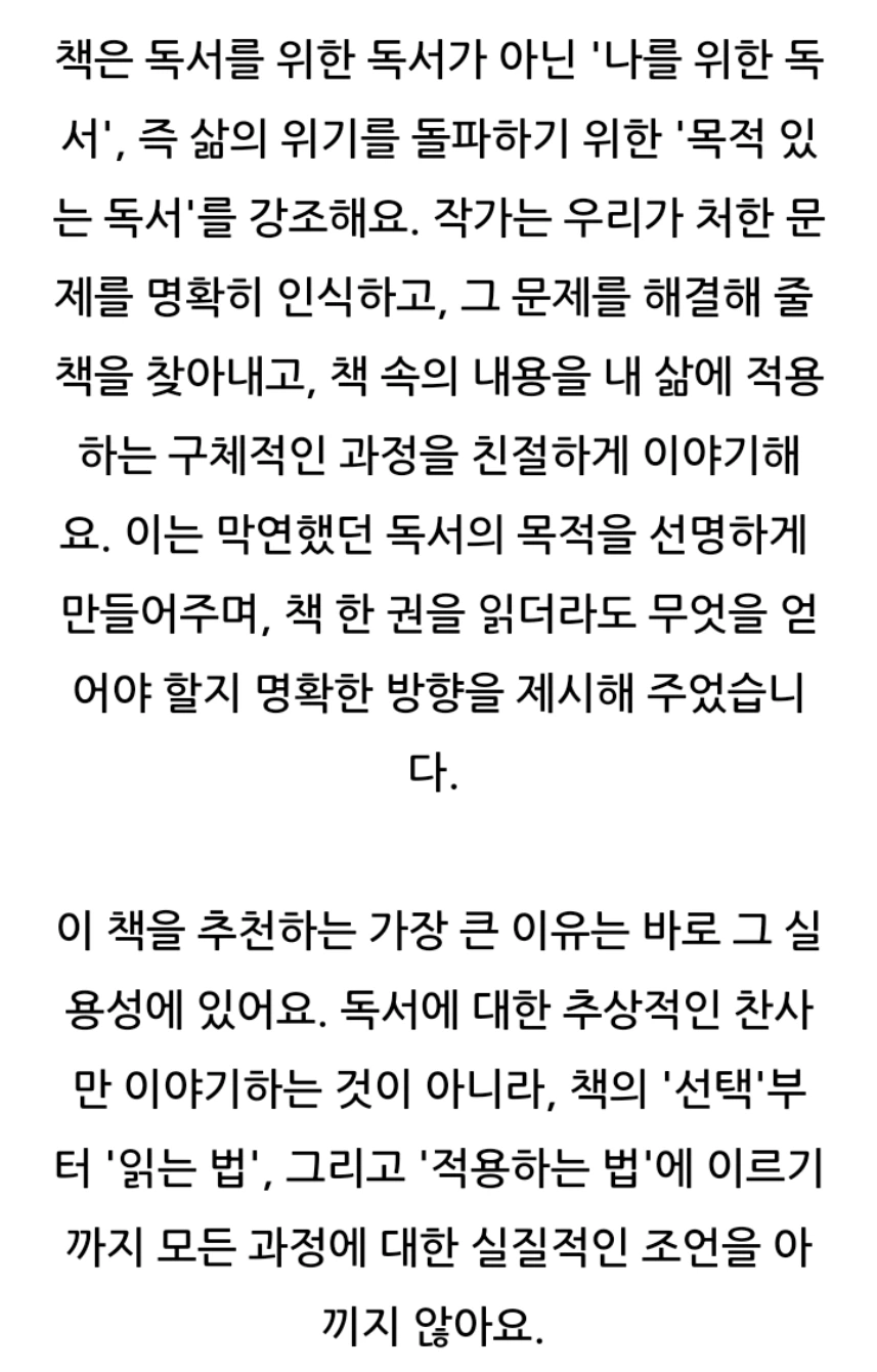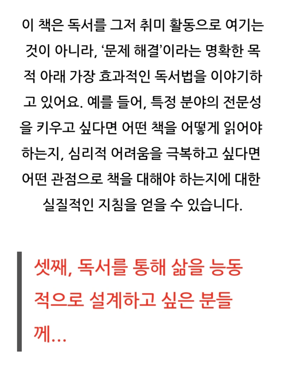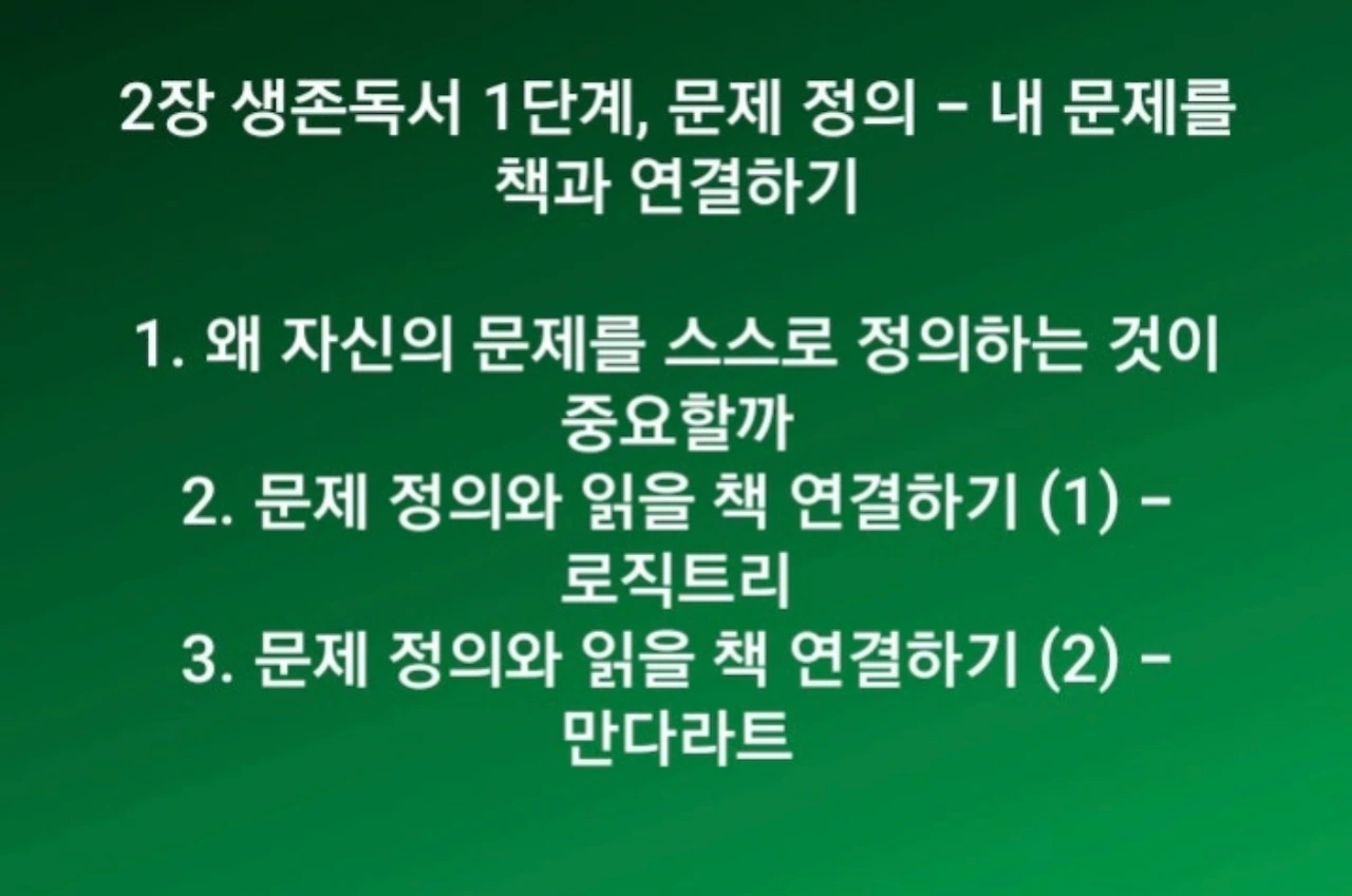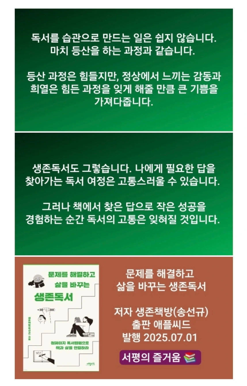 ➡️ 《문제를 해결하고 삶을 바꾸는 생존 독서》는 삶의 문제를 해결하고 변화를 이끌어내는 독서법을 알려주는 자기 계발서에요.
