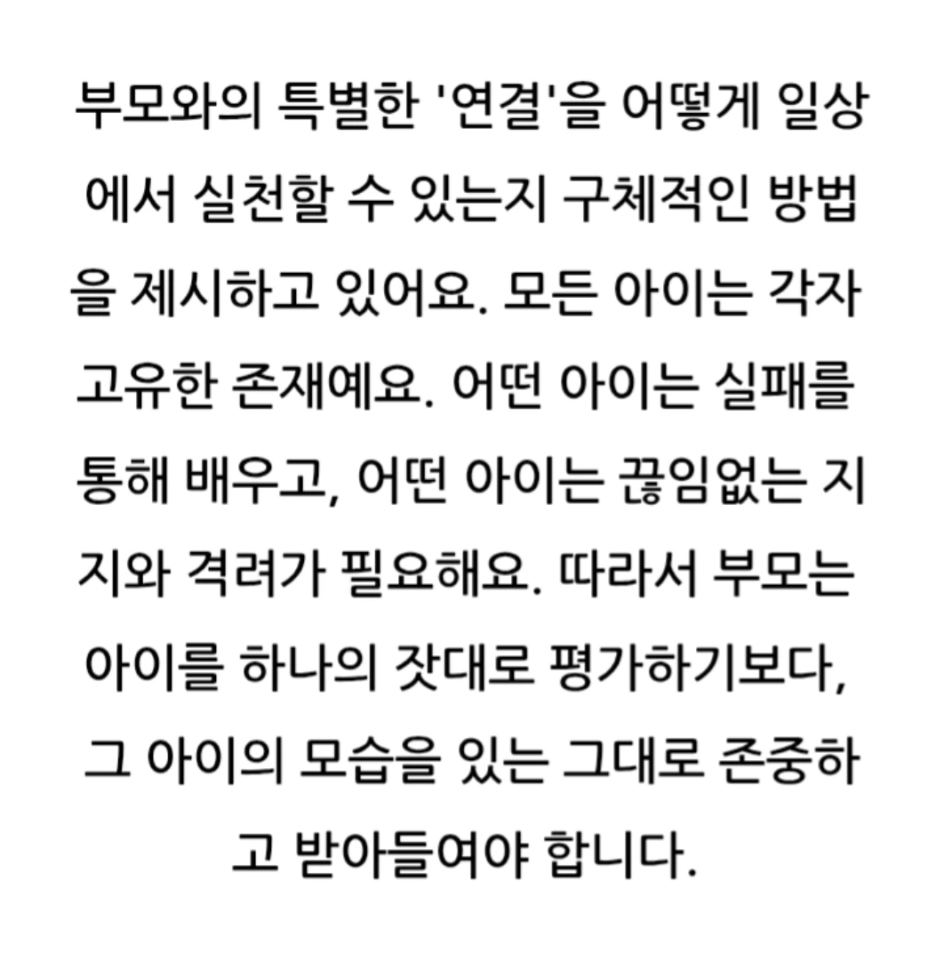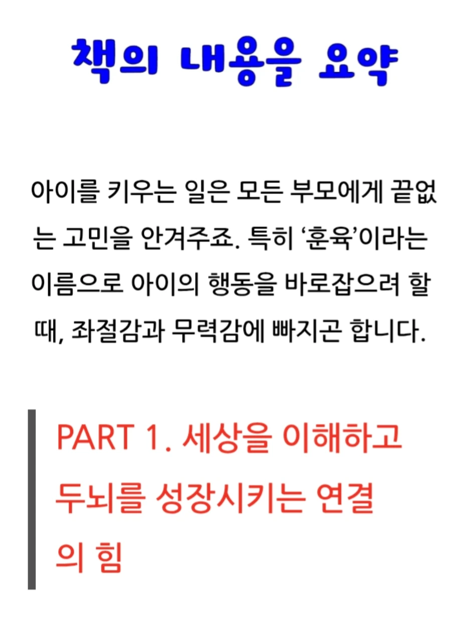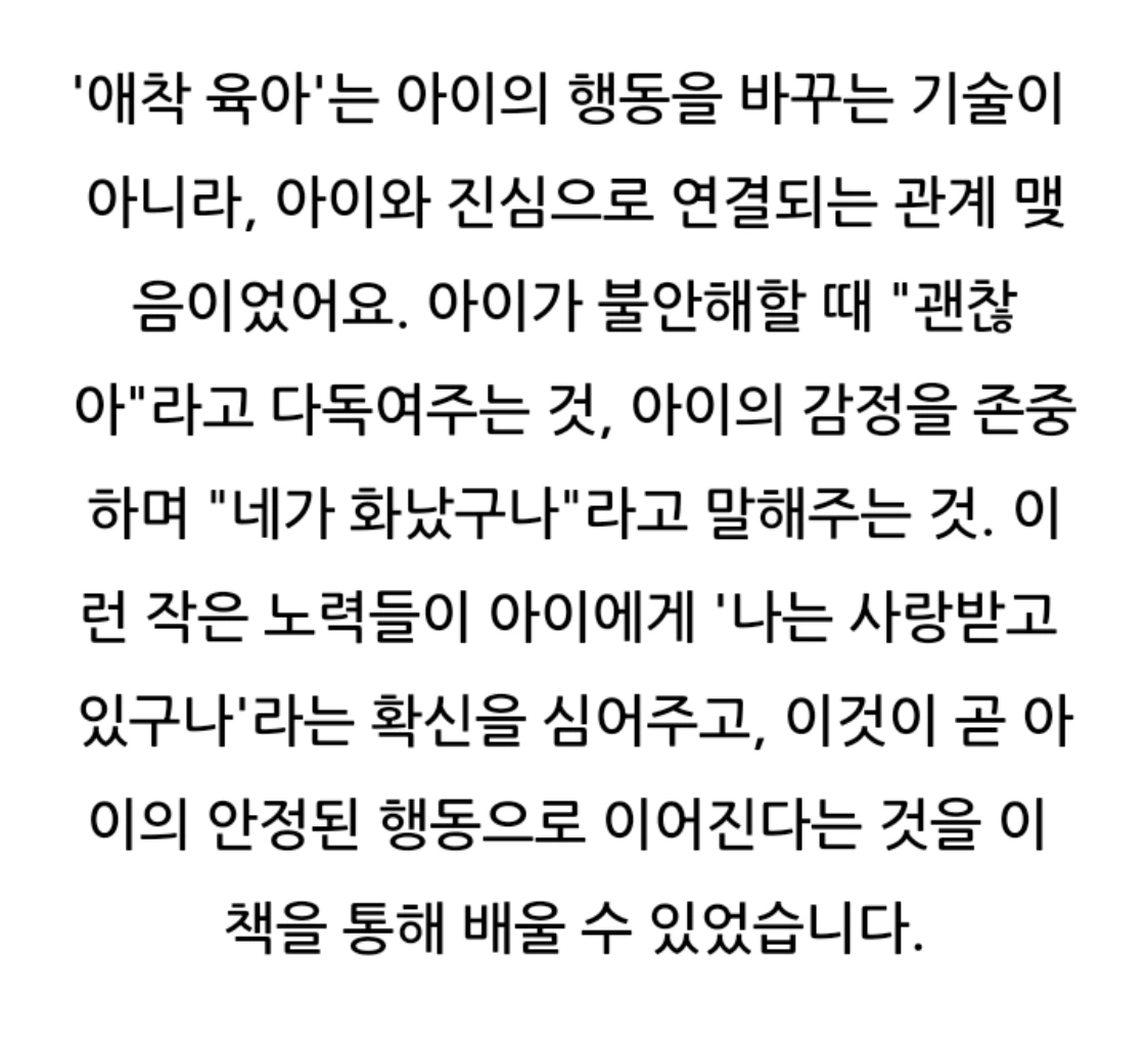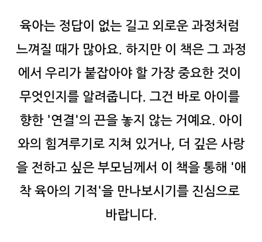 부모가 아이와 감정적으로 연결되는 애착 육아를 통해 아이의 행동 변화를 이끌어낼 수 있는 구체적인 방법들을 제시하고 있어요.