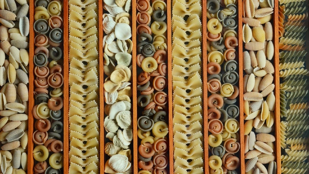리가토니. 로티니. 콘 키리에. 푸실리등 다양한 색과 모양의 면이 있다.