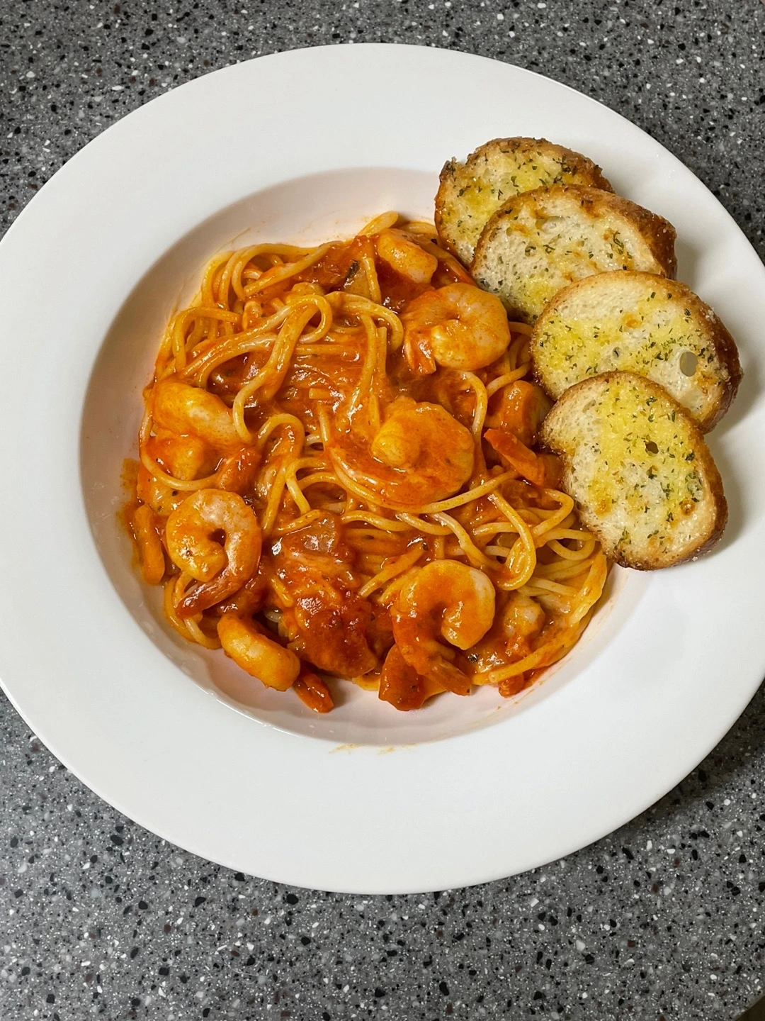 토마토 스파게티 소스 1통 (4인분). 칵테일 새우 400 g. 스파게티 면 400 g. 마늘.