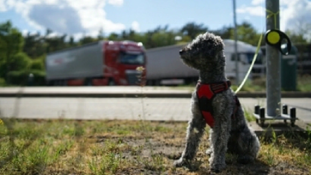 *고속도로 휴게소에서 표지판에 묶여 버려진 강아지. *