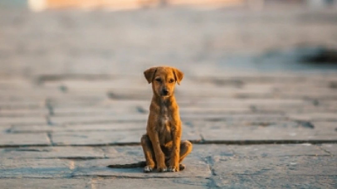*집이 없는 강아지 가 길 중앙에 앉아 있는 모습*