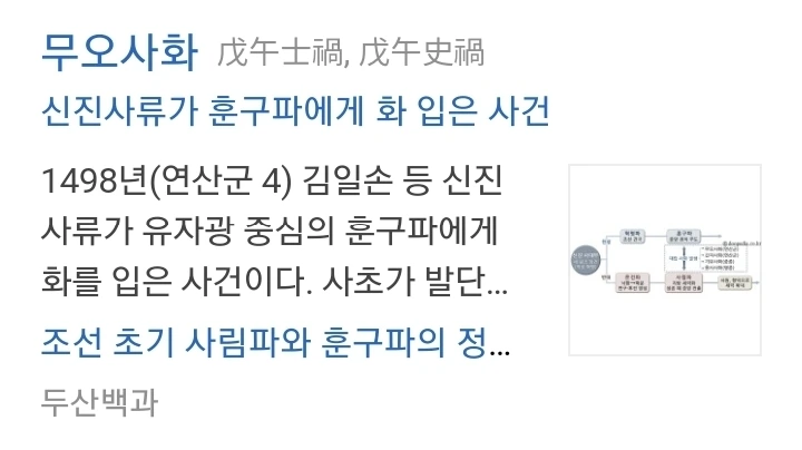 무오사화 (1498년, 연산군 4)는 훈구파가 사림파를 처형시키고 귀향 보낸 사건이다. 오늘날 서로 싸우는 민주당과 국민의 힘을 보면 이해가 빠르겠다.