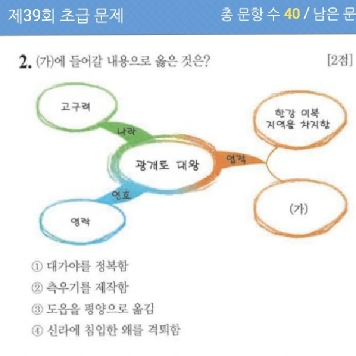 기출문제 2번은 광개토 대왕의업적을 묻는 문제다. 주어진 4지선다형문제를 하나씩 분석해 보자.