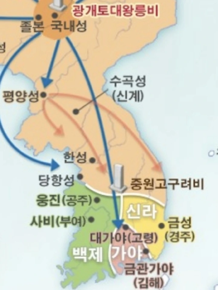 남쪽으로 파란선은 광개토 대왕, 빨간 선은 장수왕이 내려온 곳이다.