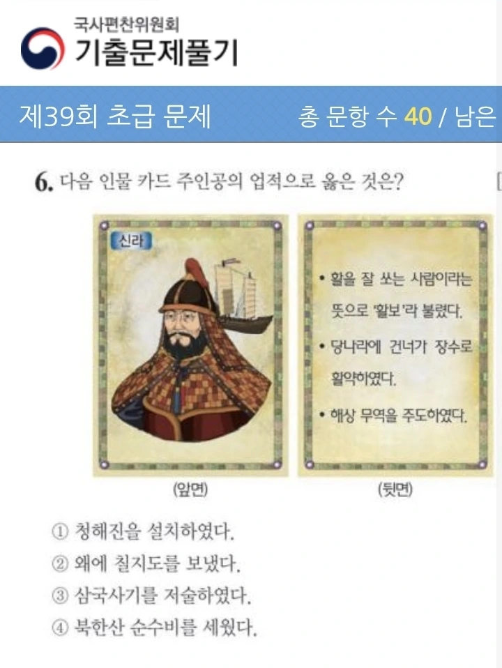 드라마로도 제작되고 워낙 잘 알려진 인물인 장보고에 대한 문제다. 그의 일대기를 여러자료를 통해 알아보자. 시험공부뿐 아니라 미처 알지 못했던 역사 지식을 쌓는데 도움이 된다.