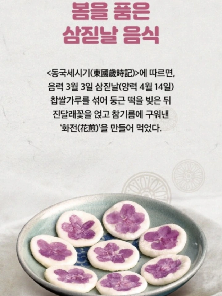 조선시대 신윤복의 풍속도를 보면 양반과 기생들이 봄꽃을 즐기러 나온 모습이 있다. 삼월 삼짇날 즈음인듯하다. 이날은 각종 민속놀이와 함께 진달래 화전, 쑥떡 등을 만들어 먹었다.