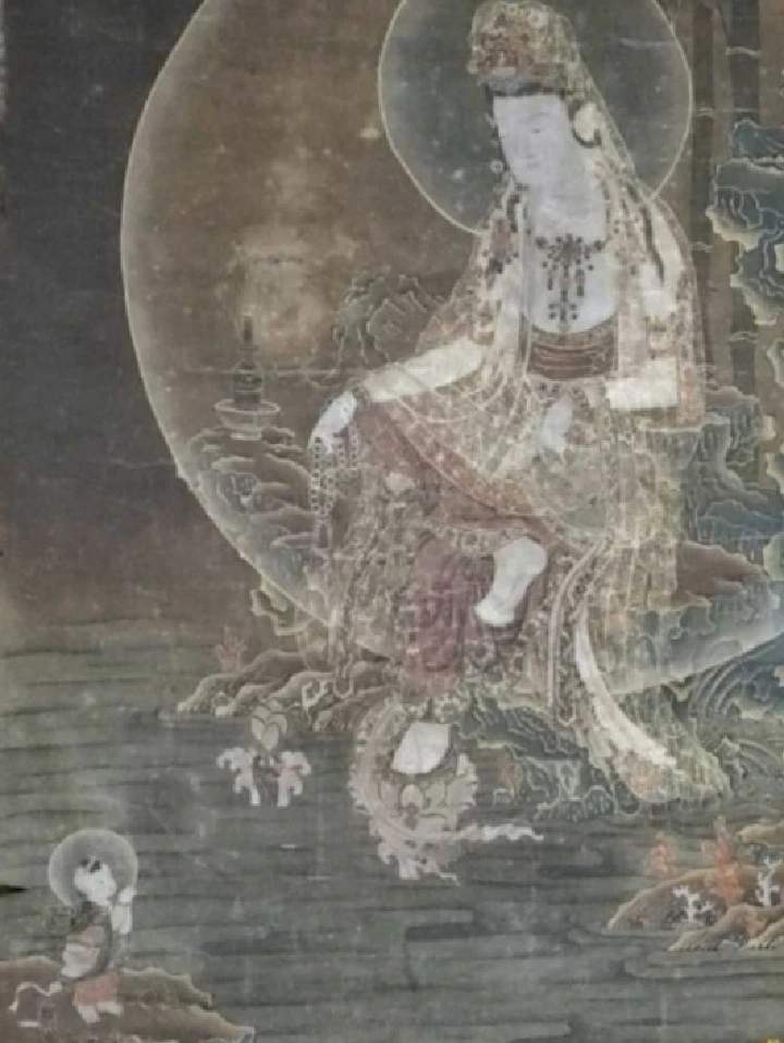수월관음도에는 스토리가 있다. 선재동자(善財童子)라는 구도자가 있었는데 53명의 선지식(善知識)인을 만나 결국 진리를 터득하고 왕생 (往生) 했다는 그가 28번째 만난 사람이 관세음보살이었다. 선재동자가 관세음보살을 만나는 장면을 그린 것이 ' 수월관음도 ' 다.