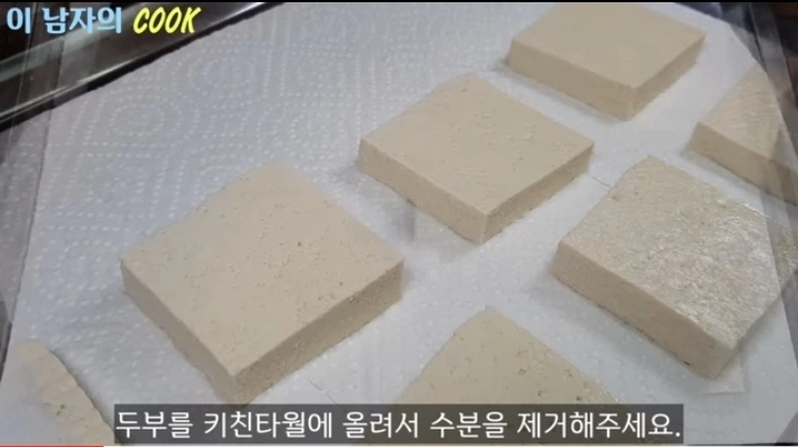 두부를 반으로 자른 후에 약 1cm 간격으로 썰어주세요. 썰어 놓은 두부는 물기 제거를 위해서 키친타월 위에 올려 주세요. 기름에 부칠 거기 때문에 수분을 제거하지 않으면 기름이 사방으로 튀어서 부엌도 엉망이 되고 손에도 튀여 마음과 손이 아야야~ 합니다. 이렇게 두부는 키친타월로 덮어서 잠시 옆에 놔두시고요.