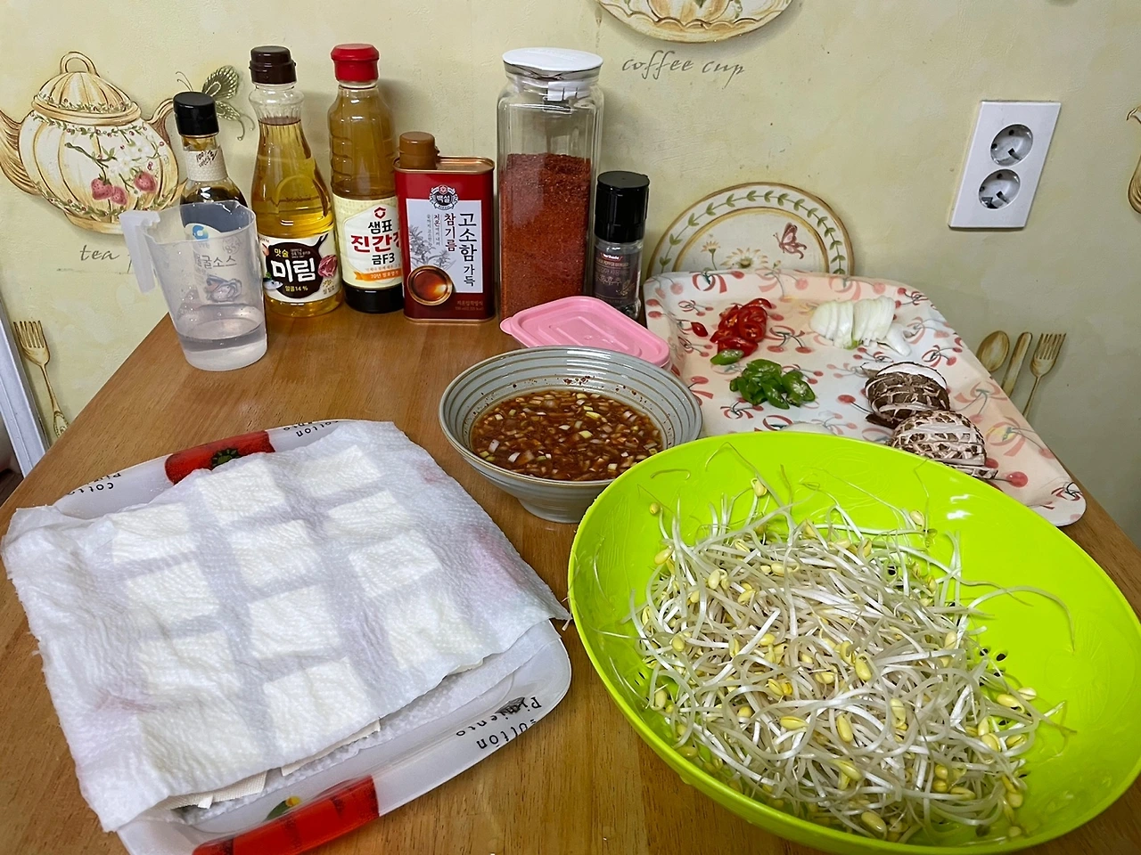 여기에 준비해 놓았던 콩나물을 넣어 주세요. 콩나물이 두부를 덮지 않도록 냄비나 팬의 가장자리에 넣어서 불필요한 신경전이 일어나지 않도록 해주시고요.