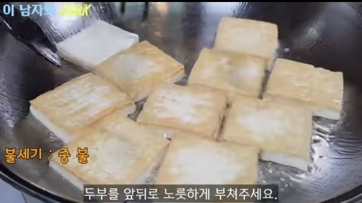 양념장이 다 만들어졌으면 팬에 식용유를 넉넉하게 두른 후에 준비해놓았던 두부를 앞뒤로 노릇하게 부쳐주세요. 두부를 부쳐서 사용하면 잘 부서지지 않을뿐더러 쫄깃하게 씹히는 식감과 두부의 고소함이 더욱 올라갑니다.