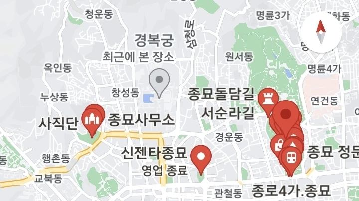 지도에서 보듯 중앙의 경복궁을 기준으로 서쪽이 사직단, 동쪽이 종묘가 있는 곳이다.