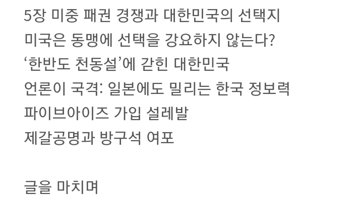 막강한 힘을 가진 미국이 우리의 동맹국이라는 사실에 우리는 환상을 가지고 있을 수 있다는 생각이 듭니다. 한국전쟁 후 체결된 한미 연합과 주한 미군주둔, 경제적 지원 등 역사적 맥락과 함께 현실적인 상황들을 다양한 관점으로 바라볼 수 있어야 합니다. 미국은 결국 자국의 이익을 추구하는 차원에서 우리를 도운 것 아닌가 하는 생각도 들구요. 국제 정세가 이렇다 저렇다 하며 우리에게 요구하는 바도 많습니다.