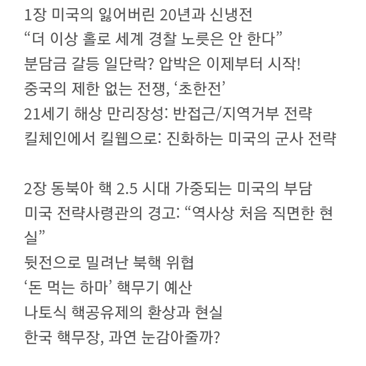 미국은 무섭게 치고 올라오는 중국이 두렵습니다. 세계의 경찰을 자처하던 미국의 입장이 바뀌어가고 있습니다. ' 왜 우리만 희생해야 하는지 ' 에 대한 물음을 던진 미군의 한마디가 현재 미국의 생각을 잘 대변해주고 있지요. 최근까지 펜타곤 출입기자였던 작가는 미국의 속마음을 생생하게 잘 알려주고 있습니다.