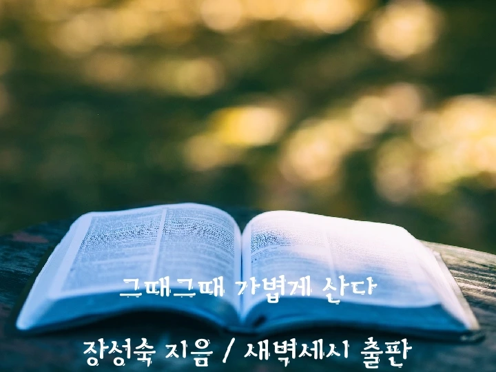 비 오는 휴일 날이 참 좋습니다. 빗소리가 즐겁고 책읽는 눈이 맑아지는 군요. 곁에 둔 따뜻한 물 한잔이 속을 든든하게 데우는 듯합니다. ' 그때그때 가볍게 산다. ' 뭔가 의미 심장한 제목의 책을 펼칩니다.우리네 삶이란것이 딱히 무어라 정의할 수 없습니다. 워낙 다양한 변수가 있기 때문이죠. 장성숙 작가님은 우리가 살면서 겪게 되는 내면의 심리를 4부로 나누어 제시하며 그때그때 마다 가볍게 살 수 있는 방법을 조언해주고 있습니다.