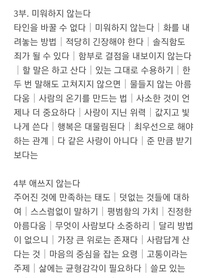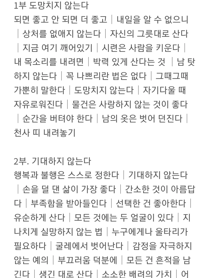 ' 그때그때 가볍게 산다 ' 는 마음을 내려 놓고 도망치지 않으며, 기대하지 않고, 미워 하지 않으며, 너무 애쓰지 말고 자신에게 맞는 균형점을 그때그때마다 채워가는 것이 아닐까 라는 생각을 해봅니다.