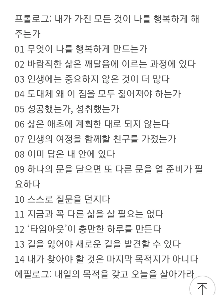 이 책에서 작가는 삶은 애초에 계획대로 되지 않지만 목적이 이끄는 삶의 방향이 무엇인지를 제시 하고 있네요. 무엇을 원하는지 ? 왜 원하는지 스스로에게 질문 하다보면 계획대로 되지 않은 삶에서 올바른 길을 찾아갈 수 있다는 메시지를 전하고 있습니다.