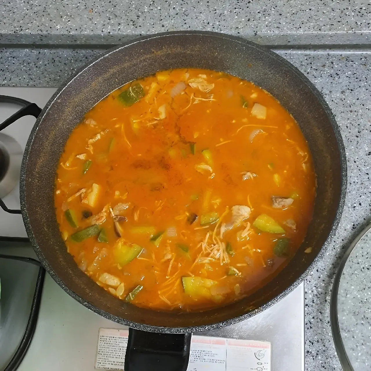 2. 손질된 감자, 양파, 호박을 고춧가루와 함께 넣고 볶다가 물을 잠길 정도로 넣고 끓인다.