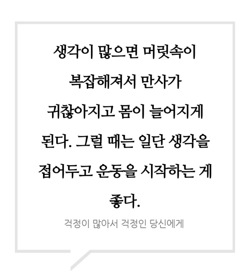 생각이 많아져 머릿속이 복잡해진다면, 일단 멈춰 서서 자신에게 물어보세요. “지금 나에게 가장 필요한 것은 무엇일까?” 그리고 운동복으로 갈아입고 밖으로 나가보세요. 운동은 우리에게 생각지 못한 선물을 안겨줄 것입니다.