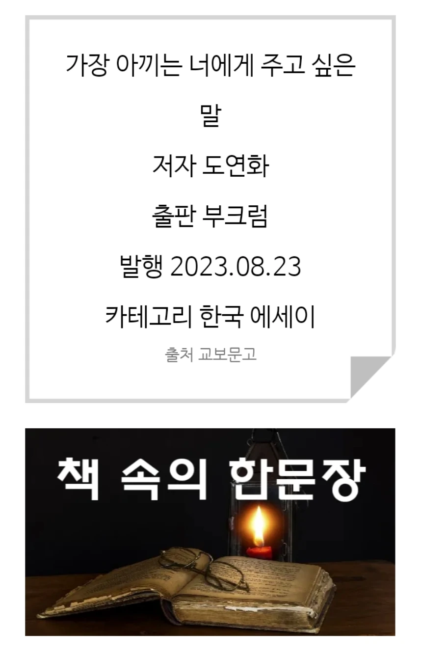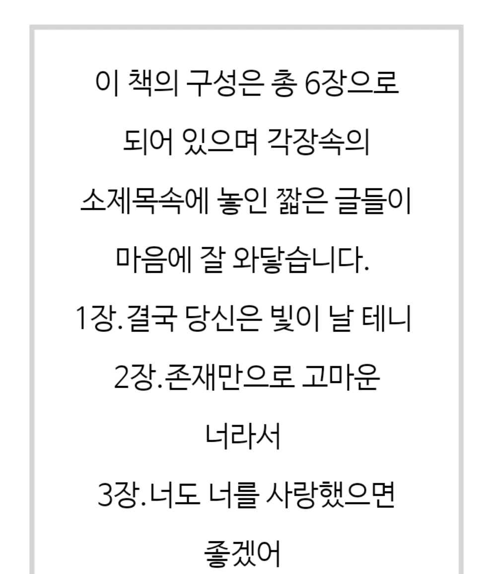 나에게 고맙다 † 나를 챙기는 연습 † 대체 불가능한 사람이 되는 법 † 퇴근 마법 † 내게 필요했던 말 † 나와의 데이트 † 보채지도, 말리지도 말 것 † 보이지 않는 배려 † 닮고 싶은 당신 † 아버지의 칭찬 † 빛나는 마음 † 말에는 사람이 담겨 있다 † 다정함은 생각보다 어려운 것 † 행복에 관하여 † 꿈은 도망가지 않는다 † 우울과 성장 † 상처받지 않았던 것처럼 † 나만 남은 순간 † 인연의 끝에서 † 무게가 없는 것 † 망설이고 있다면 † 강철이 아니잖아요 † 나의 무기 † 평온을 위한 길