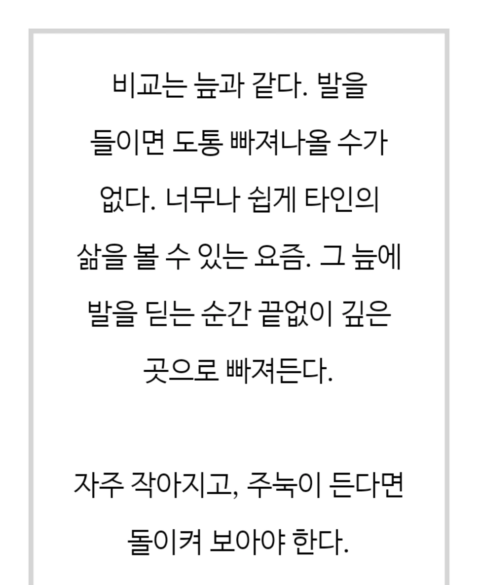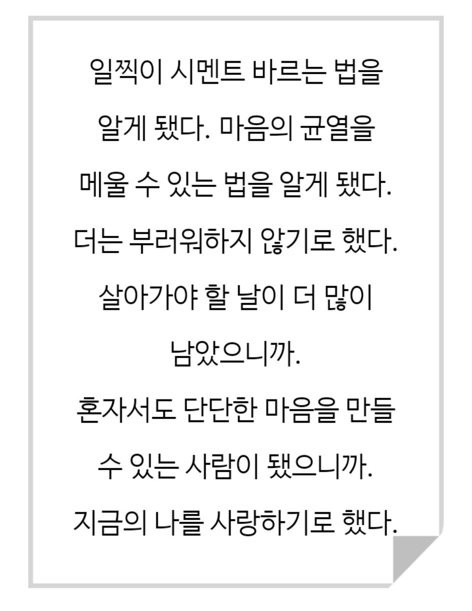 나에게는 † 하루의 끝 † 여백의 미 † 그런 시기 † 어찌할 수 없었던 것들 † 나아갈 수 있는 용기 † 재미를 지우는 욕심 † 자라나는 시간 † 돌아볼 기회 † 최선의 위로 † 한 사람을 알아 간다는 것 † 부러움을 딛고서 † 살아갈 날이 더 많이 남았으니까 † 여행과도 같은 걸음 † 행복은 연기와 같아서 † 누려 본 자만이 아는 것 † 또렷한 나로 사랑하는 것 † 연기 혹은 나 † 행복도 불행도 나로부터 † 주체적인 사람이 되는 법 † 삶의 한 조각 † 예측 불가한 삶을 위해 † 동굴 † 더 나은 나를 위한 시작 † 일상을 꾸려 가는 것 † 단단하고 다정한 사람이고 싶어서 † 조금 더 머물러 주세요 † 반쪽짜리 인생 † 두 명의 나 † 우아하게 살아가는 것 † 나를 돌아보는 노력