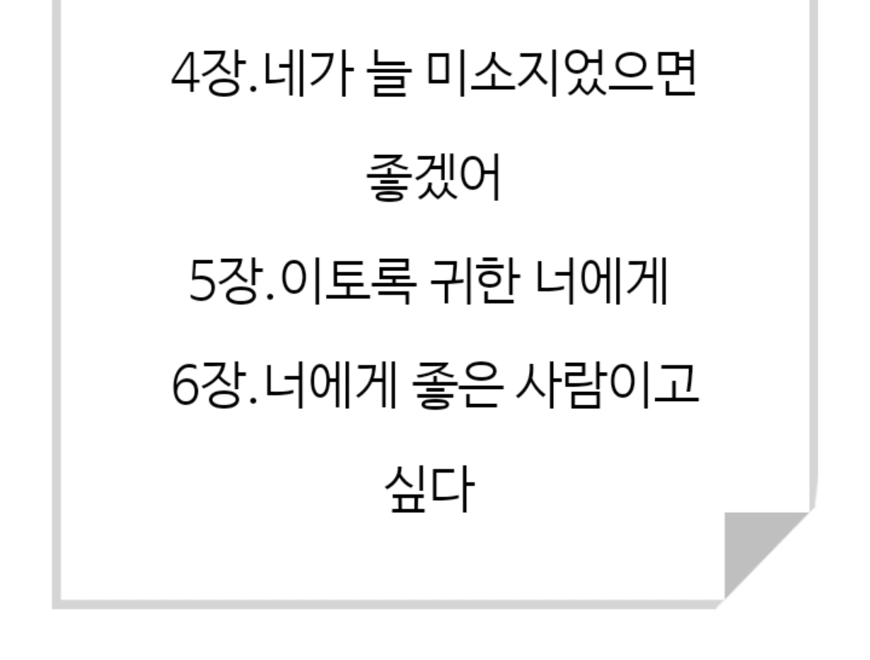 우리의 행복 † 부지런한 마음 † 우리만의 어여쁨 † 사랑의 모양 † 당신이었다 † 닮아 가는 우리 † 함께 만들어 가는 사랑, 함께 만들어 가는 우리 † 홀씨를 부는 입술 † 약속 † 잘 지내나요, 당신 † 언어 너머의 마음 † 예쁜 다툼 † 사랑을 지우는 노력 † 몰랐던 것들 † 가꾸어 가는 것 † 다툼을 함께 풀어 간다면 † 우리를 위한 길 † 좋은 사람을 만나면