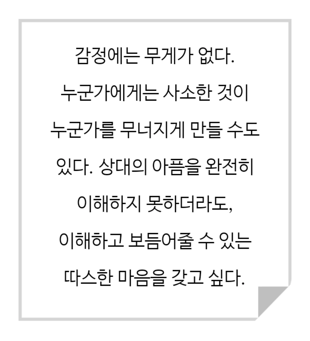 당신의 탓이 아니다 † 나의 기도 † 우리의 결 † 미운 정 고운 정 † 물결 없는 바다 † 메마르지 않도록, 전해야 하는 것 † 우리를 이어 줄 다리 † 다르기에 맞춰지는 것 † 거리 지키기 † 조화로운 관계 † 사람이 이어 주는 것 † 애쓰지 않아도 † 인연을 이어 주는 것 † 마음을 맡길 수 있는 세상 † 지나간 구름처럼 † 그럼에도, 함께하는 † 좋은 인연을 바란다면 † 숨겨진 마음 † 지치지 않는 진심 † 소중한 사람과의 관계에서 불편함을 느낄 때 † 배려 † 기다려지는 만남