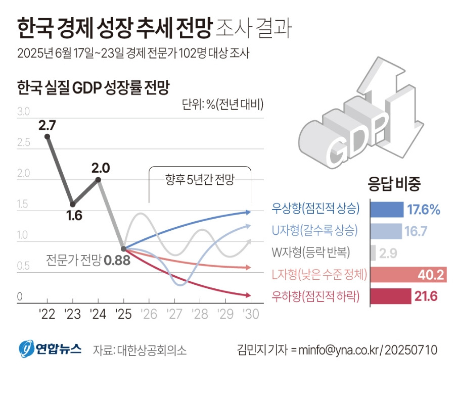 그림은 단순한 추락 곡선을 넘어선다. 전문가 응답을 유형별로 나눈 결과, ‘L자형(40.2%)’과 ‘우하향(21.6%)’ 등 비관적 시나리오가 과반을 차지했지만, ‘우상향(17.6%)’과 ‘U자형 회복(16.7%)’을 기대하는 응답도 적지 않았다.