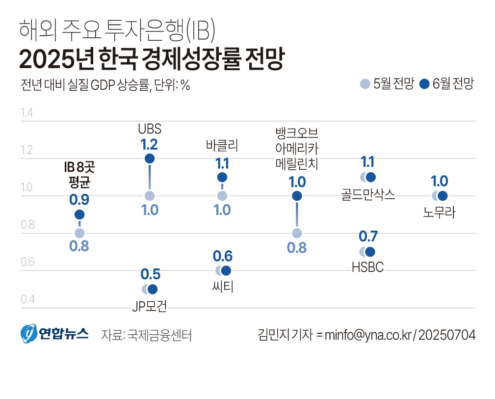 지난 7월 4일 발표된 국제금융센터 자료에 따르면, 해외 주요 투자은행(IB) 8곳은 2025년 한국의 실질 GDP 성장률을 평균 0.9%로 전망했다. 이는 앞선 5월 전망치(0.8%)보다는 소폭 상승했지만, 여전히 1%대를 넘지 못한 낮은 수치다.