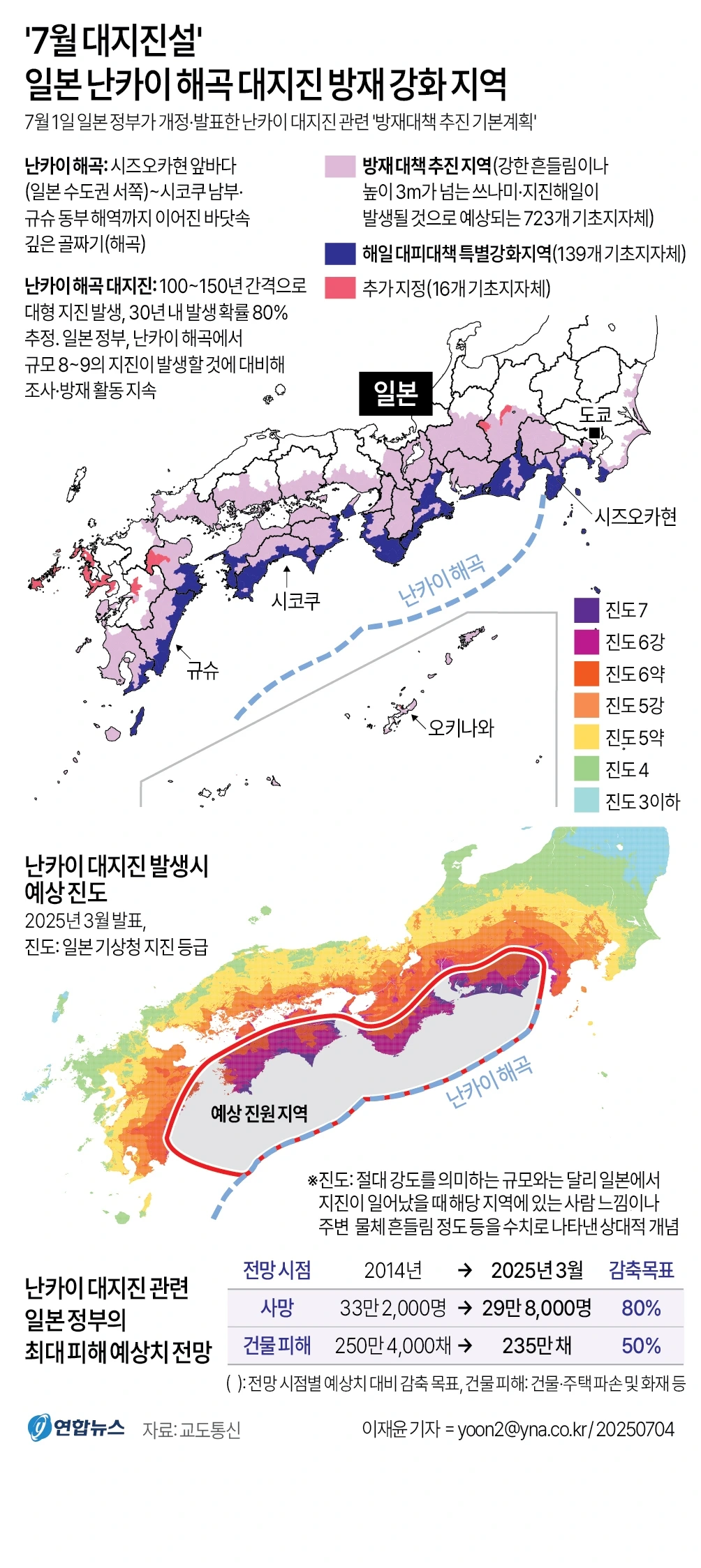 일본 기상청이 발표한 시뮬레이션에 따르면, 이번 대지진은 최대 진도 7을 기록할 수 있으며, 진앙지 인근에선 높이 3m 이상의 쓰나미도 예상된다. 이로 인해 일본 정부는 723개 기초지자체를 방재대책 추진지역으로, 139개를 해일 대피대책 특별강화지역으로 지정했다. 지진으로부터 국민을 보호하기 위한 행정적 선포이자, 어쩌면 최후통첩이다.