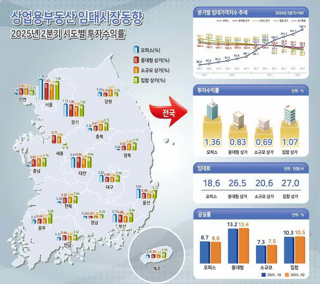 그러나 같은 시기 서울은 전혀 다른 장면을 연출한다. 수도권 핵심 업무 지구의 오피스 공실률은 5.0 %로 전국 평균보다 3.6 %포인트 낮고, 중대형·소규모 상가도 각각 8.7 % 와 5.1 %로 ‘임대인 우위’ 상태를 유지한다.