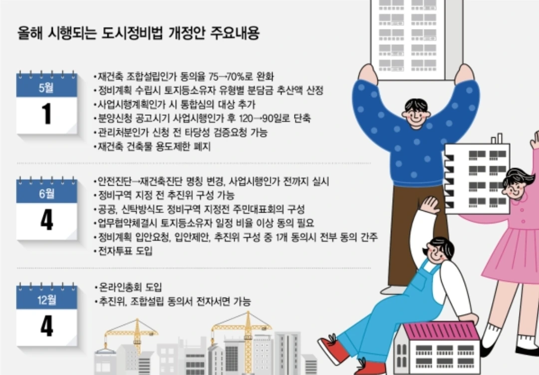 그리고 76년이 흐른 지금, 2025년 6월, 또 한 번 땅을 보는 시선이 바뀌는 순간이 다가왔다. 이번에는 땅 자체보다, 그 위에 얹힌 집과 사람들의 관계, 그리고 정비사업이라는 제도의 틀이 바뀐다. 2024년 말 개정된 도시 및 주거환경정비법이 이날부터 본격 시행되며, 새 정부의 출범과 함께 한국 도시정비사업은 구조적 전환의 기로에 선다.