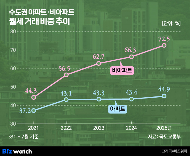 수도권 주택(아파트+비아파트) 1~7월 누적 임대차 중 월세 비중 72.5%: 국토교통부 8월 29일자 주택통계를 인용한 보도에 따르면, 최근 5년(’20~’24) 평균 54.6% 대비 +17.9%p 급증했습니다. 같은 기간 수도권 ‘아파트’ 월세 비중은 44.9%로 5년 평균 대비 +4.8%p.