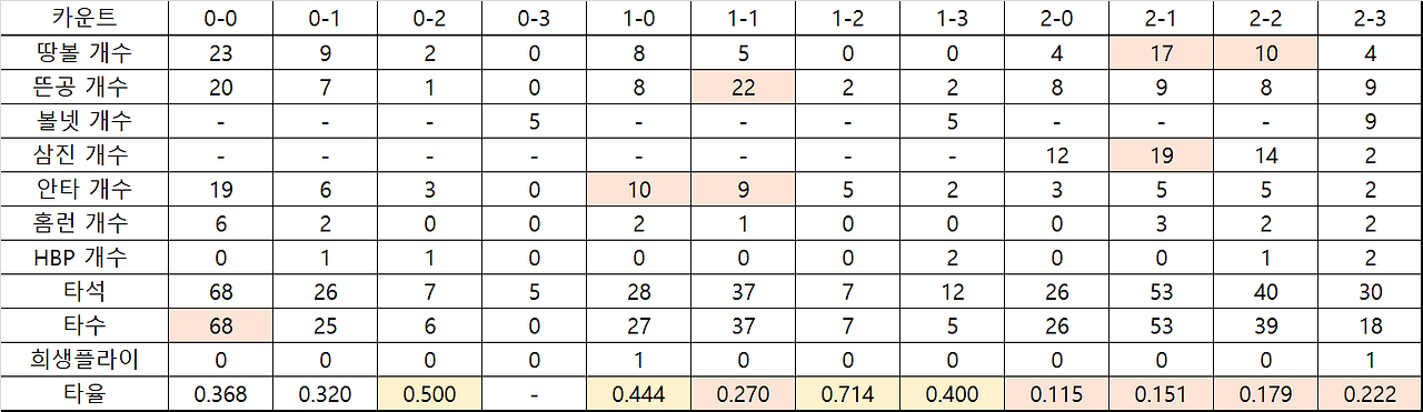 특이한 점은 1-1 카운트이다. 4번째로 많은 결과를 만든 타석인데, 뜬 볼의 개수가 22개로 제일 많다. 오히려 0-0 카운트보다 많다는 점에서 힘이 많이 들어가는 것이 아닌가라는 생각이 들었다. 9개의 안타와 1개의 홈런을 치면서 22개의 뜬 볼이라는 점은 선수가 승부처라고 생각해 몸에 힘이 들어간 체 스윙한 것이 아닌가라고 생각하였다.