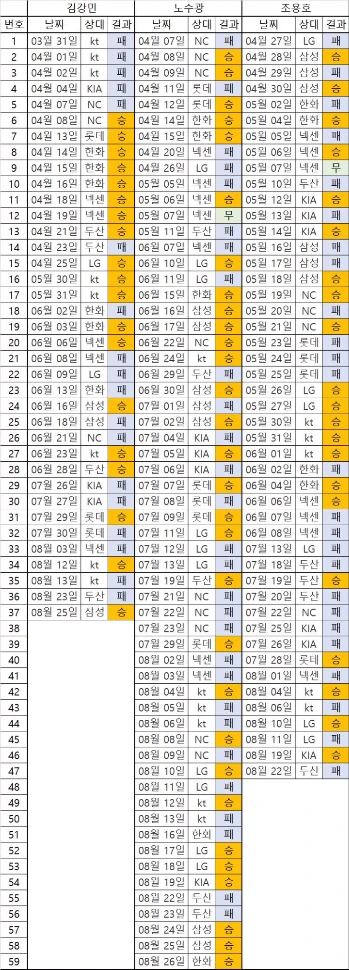 단순 비교로 이번 시즌 중견수로 뛰고 있는 세 선수의 선발 출장 시 팀 승리/패배에 대한 기록이다. 노수광 선수가 기아에서 트레이드된 이후로 가장 많은 선발 출전 기회를 얻고 있으며, 김강민, 조용호 선수도 어느 정도 출전 기회를 얻었음을 알 수 있다. 중견수 자리가 고정되지 않고, 세 선수가 번갈아 출전하면서 다른 선수가 중견수 출장을 하면 다른 외야 자리에서 수비하는 경우가 많기 때문에 이 데이터는 재미로 한 번 체크해 보았다.