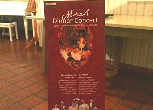 디너 콘서트장에 가는 길, 방향을 잃어서 헤매고 있는 가운데 어떤 한국인 가족분이 사진을 찍어 달라고 하셨다. 사진을 한 장 찍어드리니 그쪽에서도 우리를 한 장 찍어주시기도 했다.겨우겨우 길을 찾아서 디너 콘서트장으로 들어왔다. 공연은 성 페터 대주교청 교회(Stift St. Peter Salzburg)의 내부 식당에서 진행되었다.