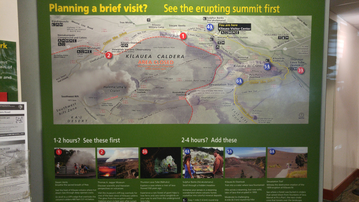 킬라우에아 분화구 안쪽은 위험하므로 출입금지다. 우리는 오늘 재거 뮤지엄에 가서 킬라우에아의 할레마우마우 분화구를 구경한 후에 킬라우에아 분화구 오른쪽에 있는 이키 크레이터 트레일을 가볼 예정이다.