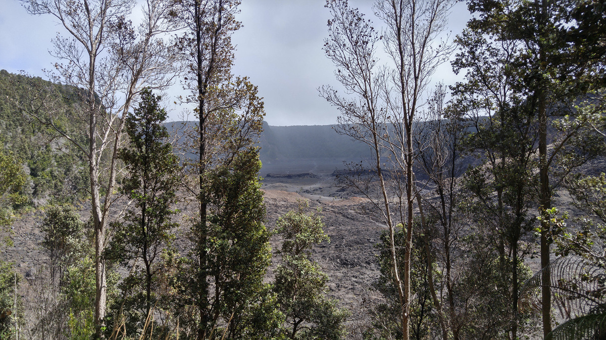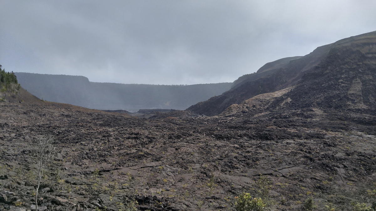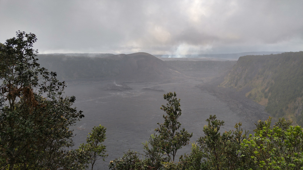비 오는 이키 크레이터의 모습이다. 멀리 할레마우마우에서 솟아오르는 연기도 보인다.