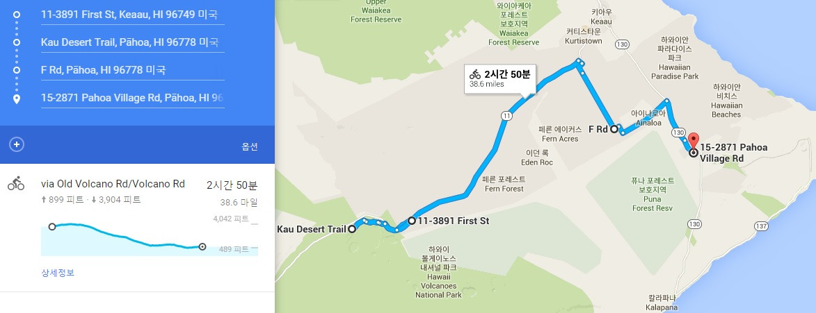 자전거를 탄 총 거리는 65km 남짓... 자전거를 많이 타지는 않았지만 화산 국립공원에서 이런저런 활동을 많이 한 하루였다. 내일은 빅아일랜드 동부의 옷걸이 모양 길을 달려서 빅아일랜드의 큰 도시인 힐로(Hilo)까지 가야 한다.